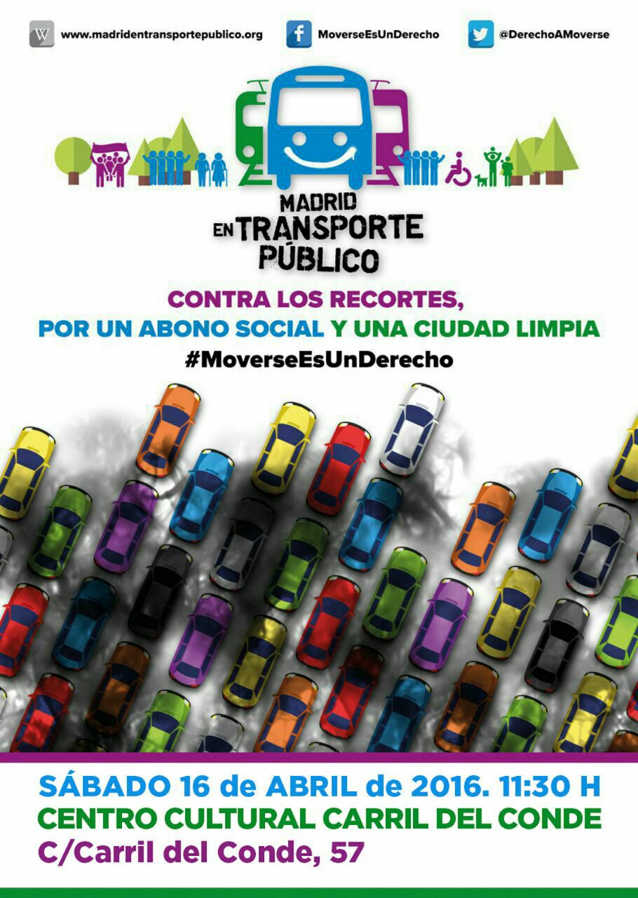 La Asamblea de la Plataforma Madrid en Transporte Público celebra este sábado 16 de abril a las 11.30 horas en el centro cultural Carril del Conde (Calle Carril del Conde, 57) una charla para darse a conocer en nuestro distrito con el objetivo de crear un grupo de trabajo específico de movilidad y transporte en Hortaleza.
