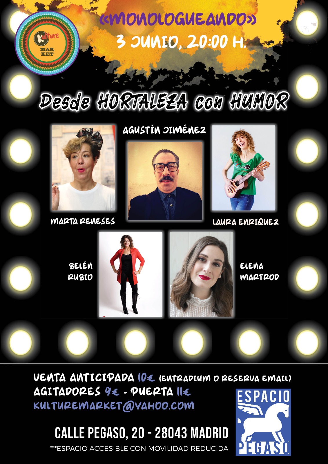 El sábado 3 de junio la asociación Kulture Market organiza de nuevo el espectáculo de monólogos Desde Hortaleza con Humor en el Espacio Pegaso (calle Pegaso, 20).