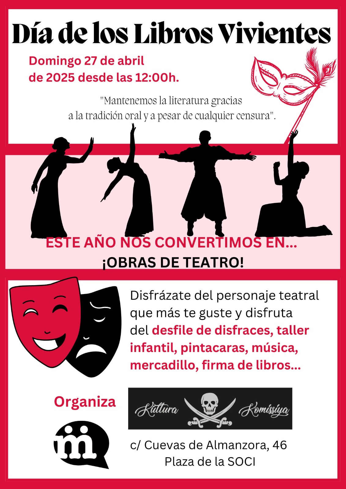 El domingo 27 de abril, a las 12.00 horas, para disfrutar el Día del Libro, Kultura Komissiya organiza de nuevo el Día de los Libros Vivientes 2025 en la plaza de la Soci de Manoteras (calle Cuevas de Almanzora, 46 posterior).