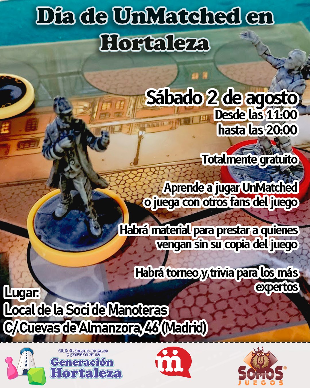 El sábado 2 de agosto de 11.00 a 20.00 horas, no te pierdas el Día de UnMatched en Hortaleza que organiza Generación Hortaleza, en colaboración con Somos Juegos, en la sede de la Soci de Manoteras (Cuevas de Almanzora, 46) gracias a la comunidad madrileña del juego.
