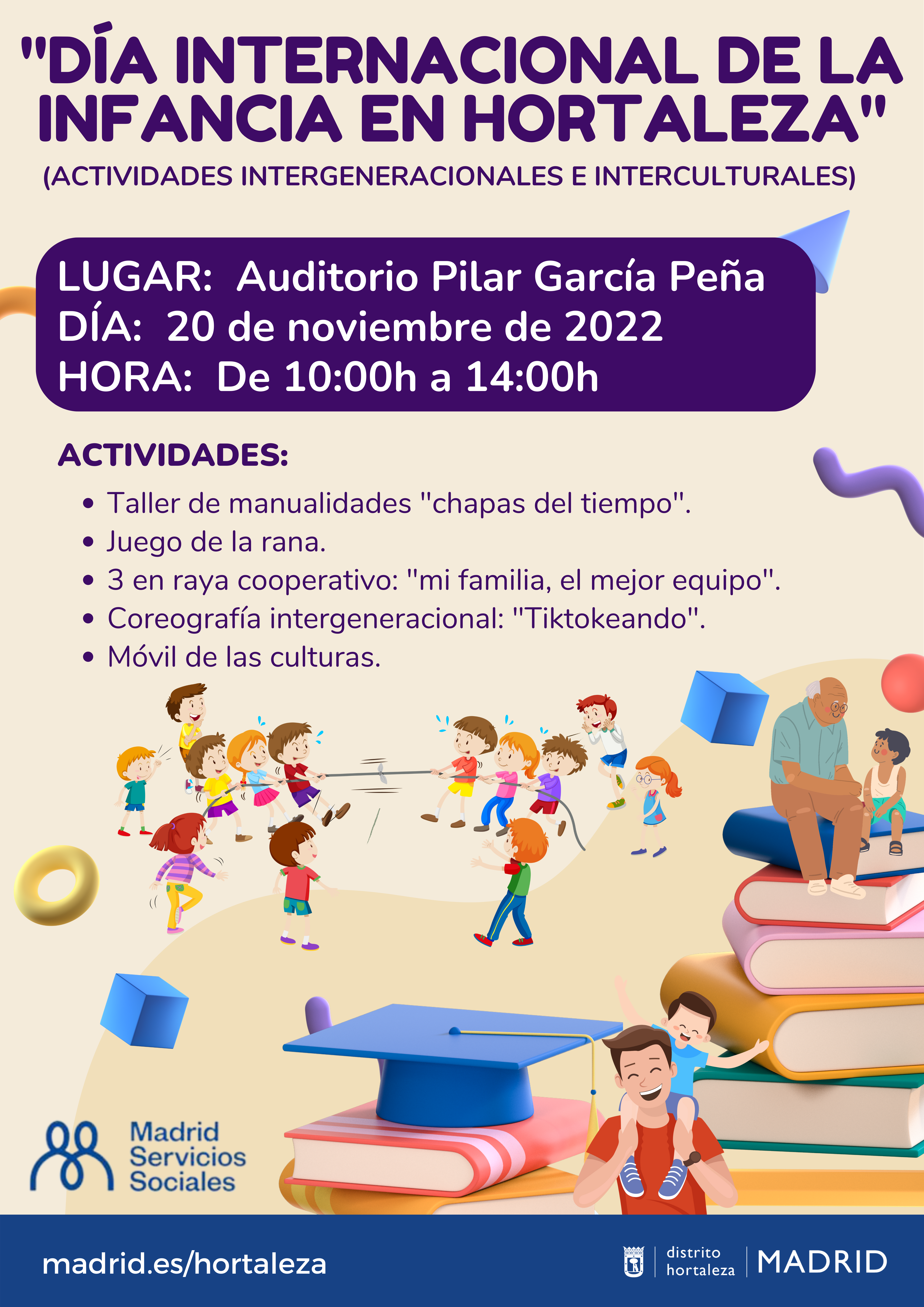 El domingo 20 de noviembre de 10.00 a 14.00 horas, para celebrar el Día Internacional de la Infancia en Hortaleza, el Departamento de Servicios Sociales del distrito organiza una jornada de actividades intergeneracionales e interculturales en el auditorio Pilar García Peña (Carretera de Canillas, 2).