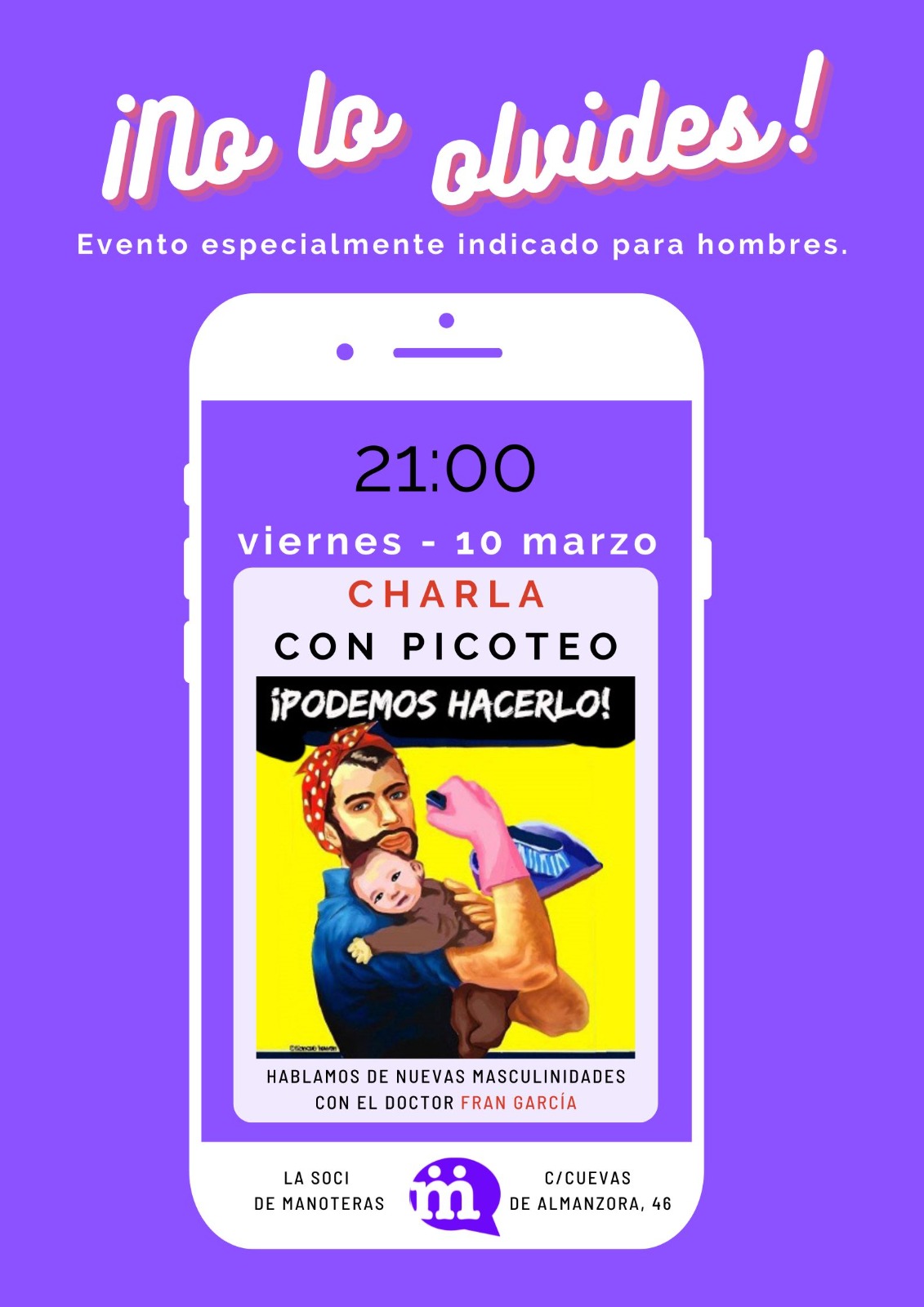 El viernes 10 de marzo a las 21.00 horas, habrá charla y picoteo bajo el título ¡Podemos hacerlo! donde se tratarán las nuevas masculinidades con el doctor Fran García.