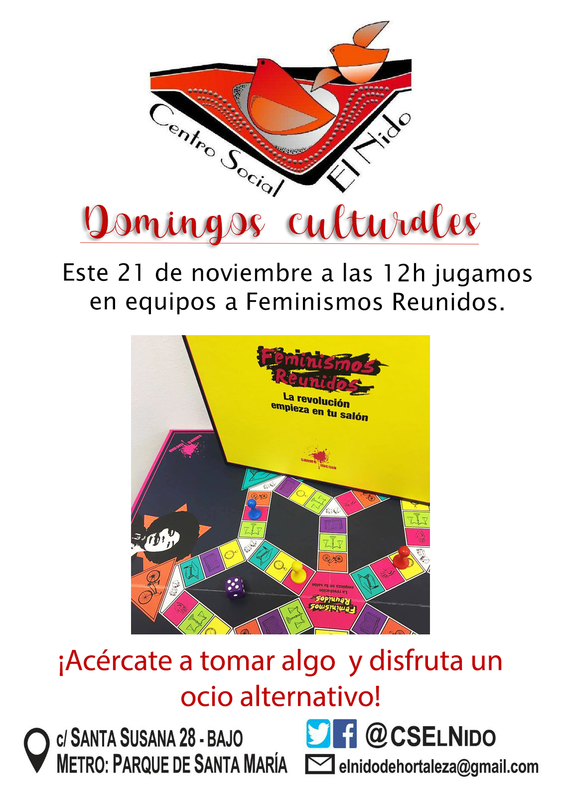 Este 21 de noviembre, a las 12.00 h, invitan al vecindario a participar en el juego Feminismos Reunidos, mientras nos tomamos algo y charlamos para disfrutar de un ocio alternativo.