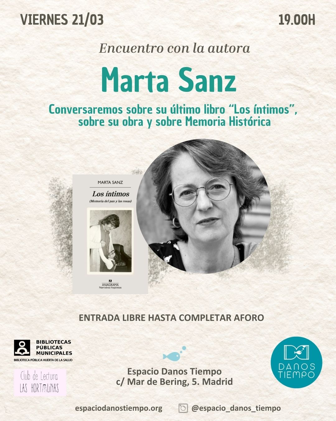 El viernes 21 de marzo a las 19.00 horas, el vecindario está invitado a participar en un encuentro con la escritora Marta Sanz donde se conversará sobre su último libro, Los íntimos (Memoria del pan y las rosas), así como sobre su trayectoria literaria y la importancia de la memoria histórica en su obra, en el Espacio Danos Tiempo (calle Mar de Bering, 5).