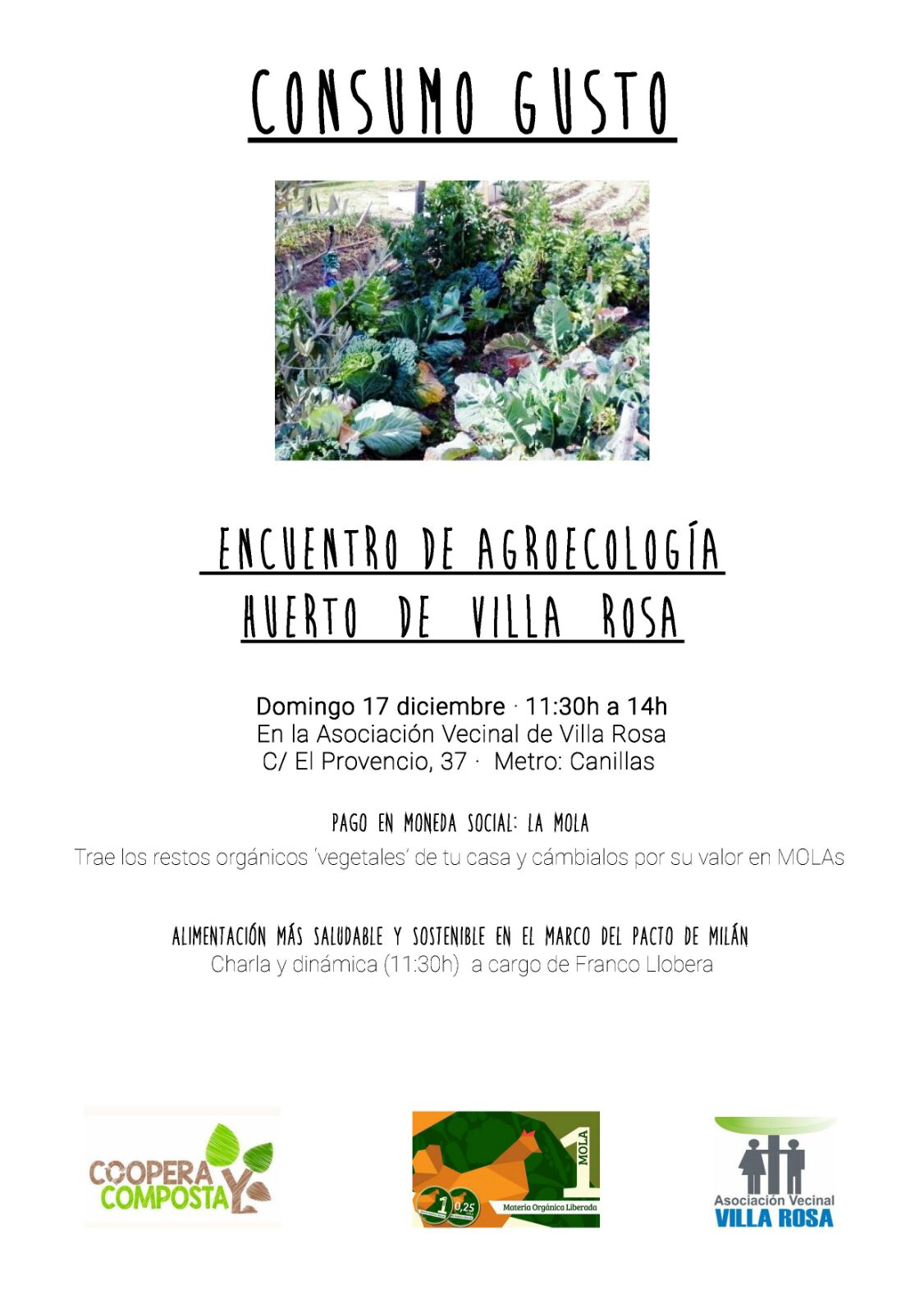 El domingo 17 de diciembre, desde las 11.30 a las 14.00 horas, se celebra en la asociación vecinal Villa Rosa (Provencio, 37) un Encuentro de Agroecología, que comenzará con una charla y dinámica sobre alimentación más saludable y sostenible en el marco del Pacto de Milán a cargo de Franco Llobera. Podrá realizarse el pago en Molas y llevar los restos orgánicos vegetales de casa para cambiarlos por su valor en dicha moneda social.