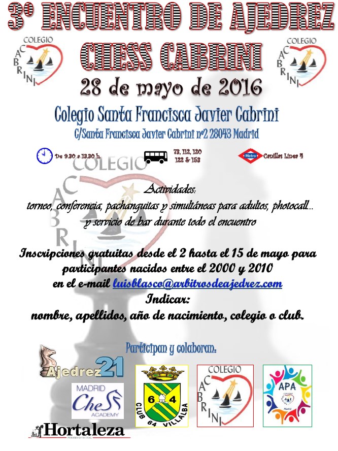 El Encuentro de ajedrez Chess Cabrini comenzará a las 9:30 horas con la entrega de las acreditaciones en el colegio, situado en la calle Santa Francisca Javier Cabrini número 2 (Metro Canillas). El torneo comezará a las 10:45 horas, y en paralelo se ofrecerá la conferencia ‘Ajedrez educativo’, impartida por la Madrid Chess Academy. La entrega de trofeos será a las 13:30 horas.