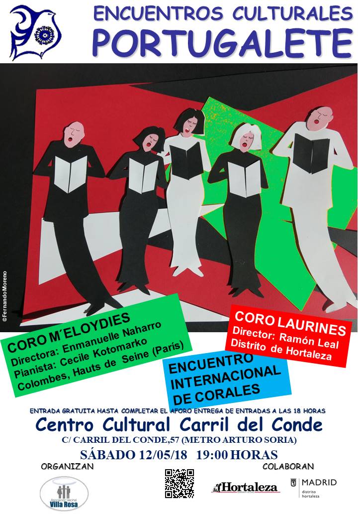 El sábado 12 de mayo a las 19.00 horas, se celebra en el centro cultural Carril del Conde (Carril del Conde, 57) un Encuentro Internacional de Corales con el coro M’Eloydies, procedente de Colombes, Hauts de Seine (París), con 28 participantes acompañados al piano por Cecile Kotomarko y dirigidos por la conocida soprano Enmanuelle Naharro, y el coro hortalino Laurines, con 16 participantes y Ramón Leal (prestigioso pianista) como director.