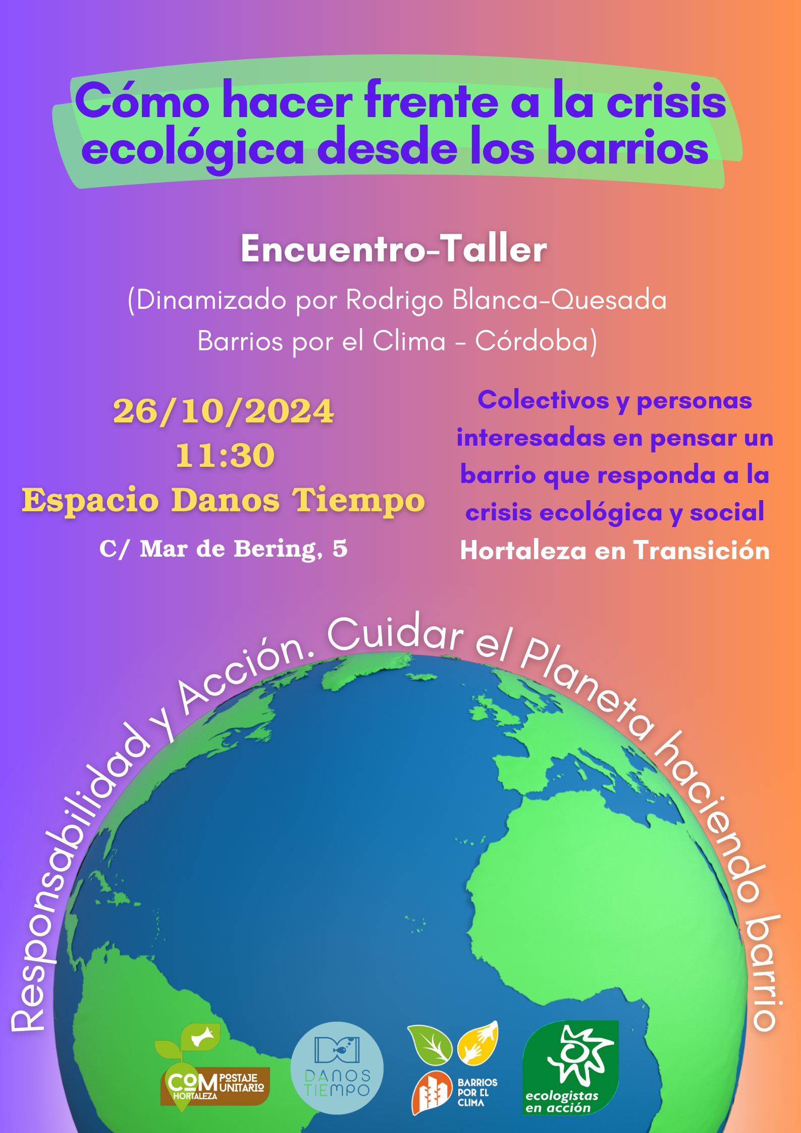 La Asociación de Compostaje Comunitario organiza el sábado 26 de octubre a las 11.30 horas el Encuentro Taller de Barrios por el Clima en el local del Espacio Danos Tiempo (calle Mar de Bering, 5), donde, bajo la dinamización de Rodrigo Blanca-Quesada perteneciente a Barrios por el Clima, los colectivos y personas asistentes pensarán juntas en un barrio que responda a la crisis ecológica y social.