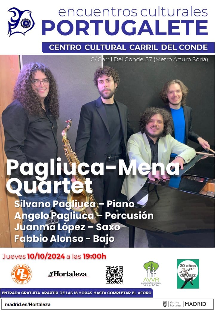 El jueves 10 de octubre a las 19.00 horas, podrá disfrutarse con el concierto de Pagliuca-Mena Quartet, una banda de jazz con sede en Madrid, que fusiona influencias del flamenco y de las músicas latinoamericanas.