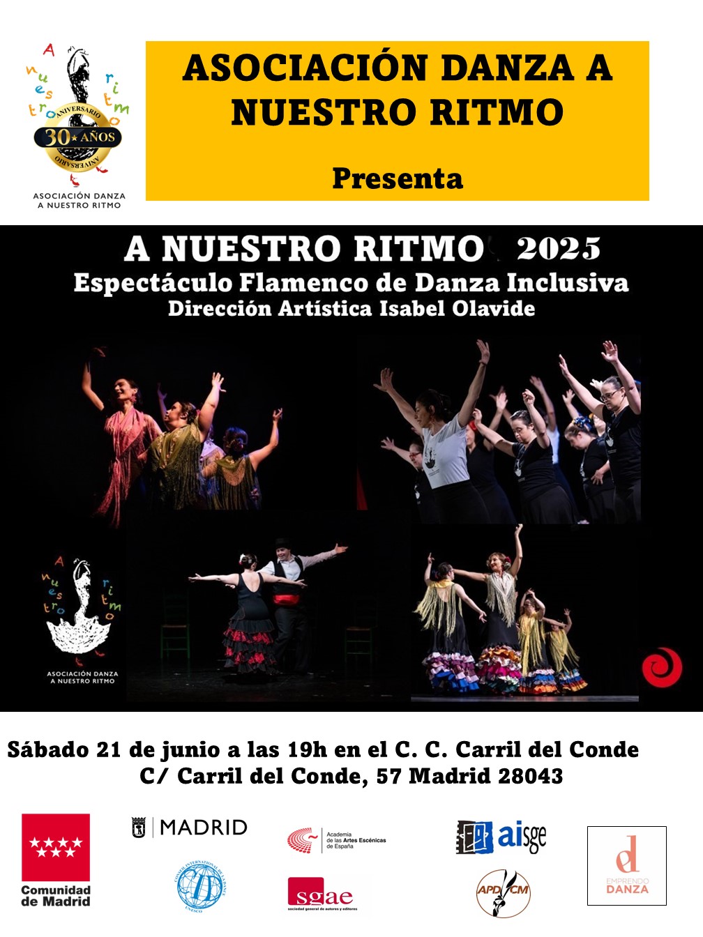 El sábado 21 de junio a las 19.00 horas, disfruta del espectáculo flamenco de danza inclusiva de la asociación Danza a Nuestro Ritmo de Isabel Olavide en el auditorio del centro cultural Carril del Conde (calle Carril del Conde, 57).