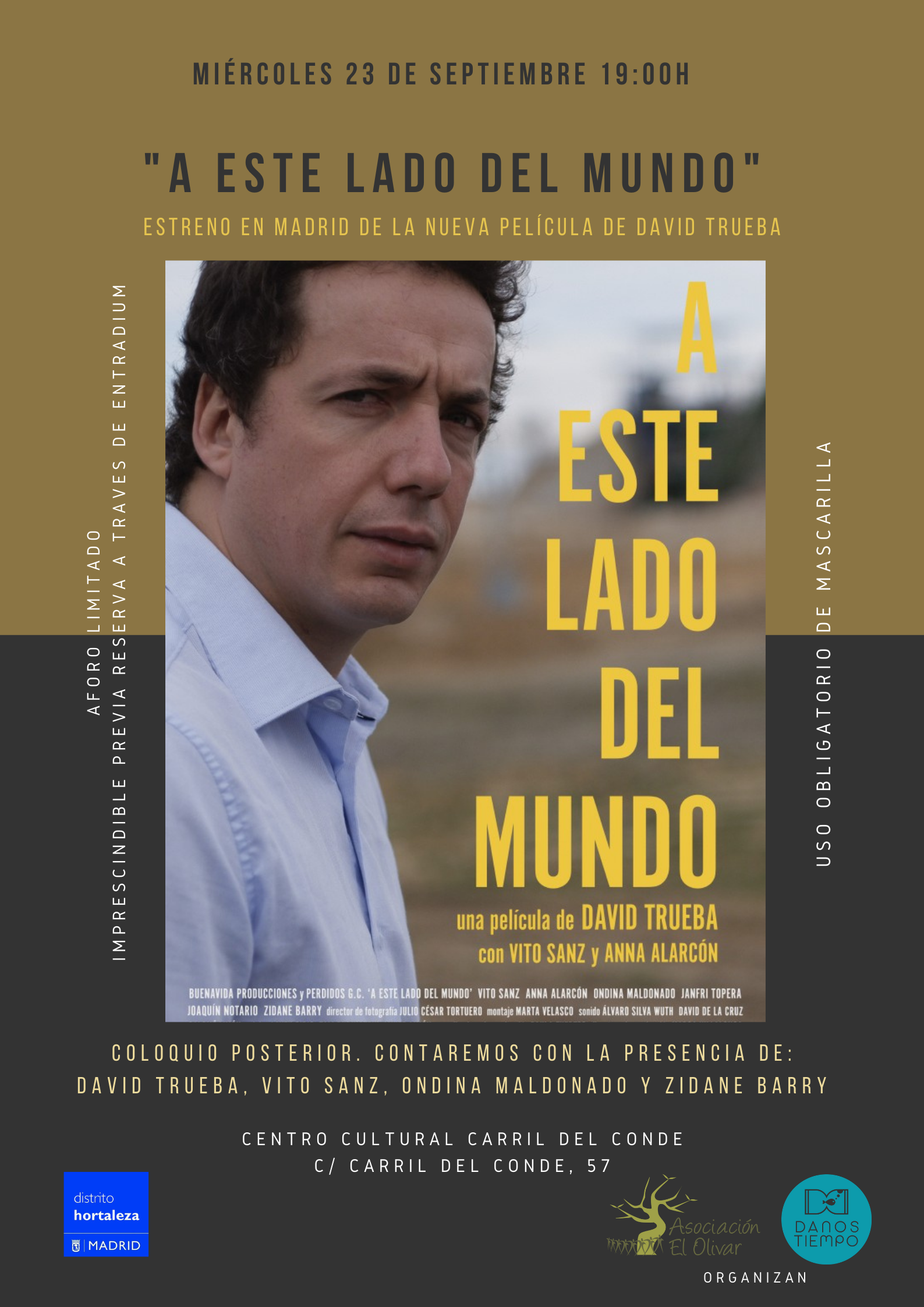 - Etiquetas del Evento:A este lado del mundo, Asociación El Olivar, Cine y coloquio, David Trueba, Espacio Danos Tiempo, Los Veranos de la Plaza de Danos Tiempo, Ondina Maldonado, Vito Sanz, Zidane Barry