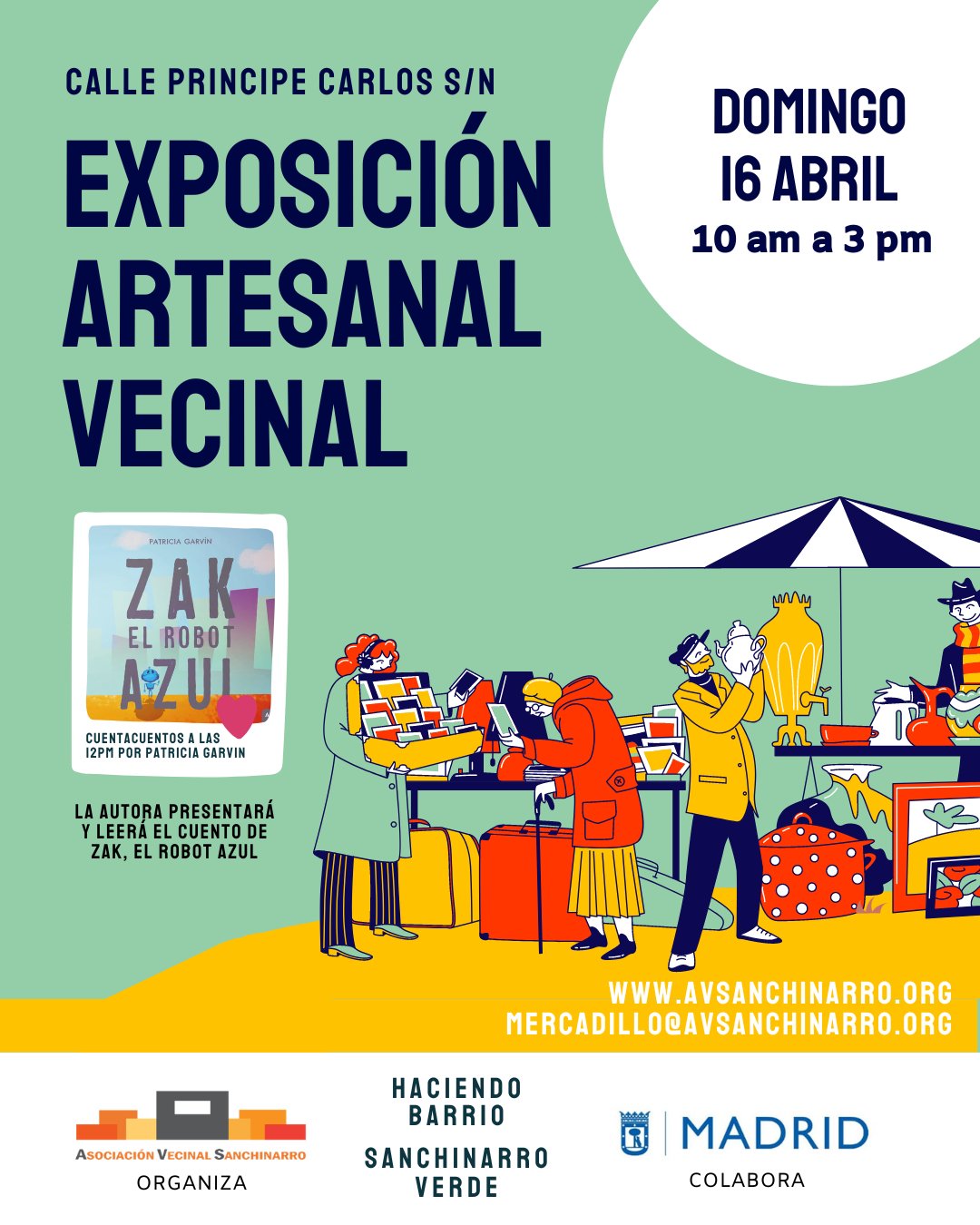 El domingo 16 de abril de 10.00 a 15.00 horas, se celebra una nueva exposición artesanal vecinal en Sanchinarro organizada por la asociación de vecinos del barrio en la calle Príncipe Carlos, con más de 30 puestos que traen: artesanía, complementos, juguetes, decoración, ropa y libros, entre otros muchos artículos.
