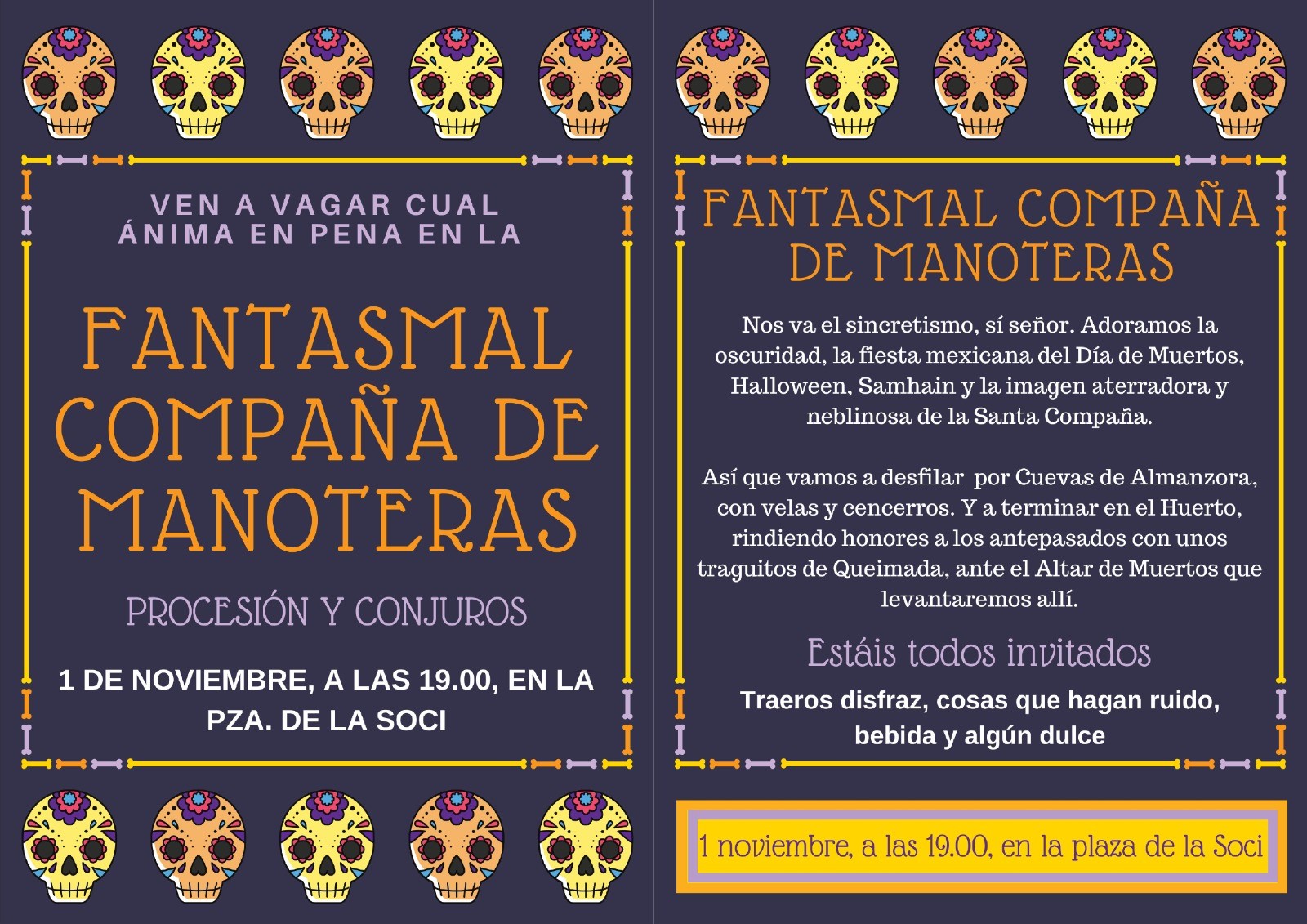 El viernes 1 de noviembre, a las 19.00 horas, una inquietante procesión, la Fantasmal Compaña de Manoteras, recorrerá el barrio con sus disfraces desde La Soci de Manoteras (Cuevas de Almanzora, 46) hasta el Huerto Comunitario de Manoteras con un ritual sincrético atemporal.