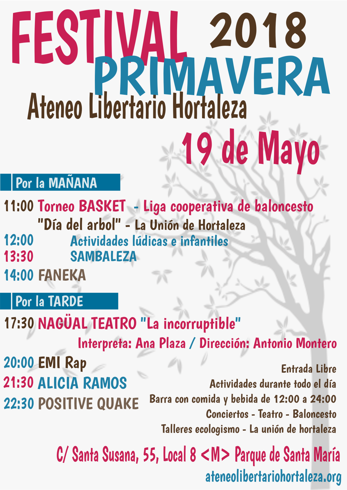 El sábado 19 de mayo, se celebra el Festival de Primavera Libertaria en el Ateneo Libertario de Hortaleza (Santa Susana, 55, local 8). La jornada comenzará a las 11.00 con un torneo de basket, seguido de actividades lúdicas e infantiles, teatro, talleres de ecologismo y música con Sambaleza, Faneka, EMI Rap, Alicia Ramos y Positive Quake.