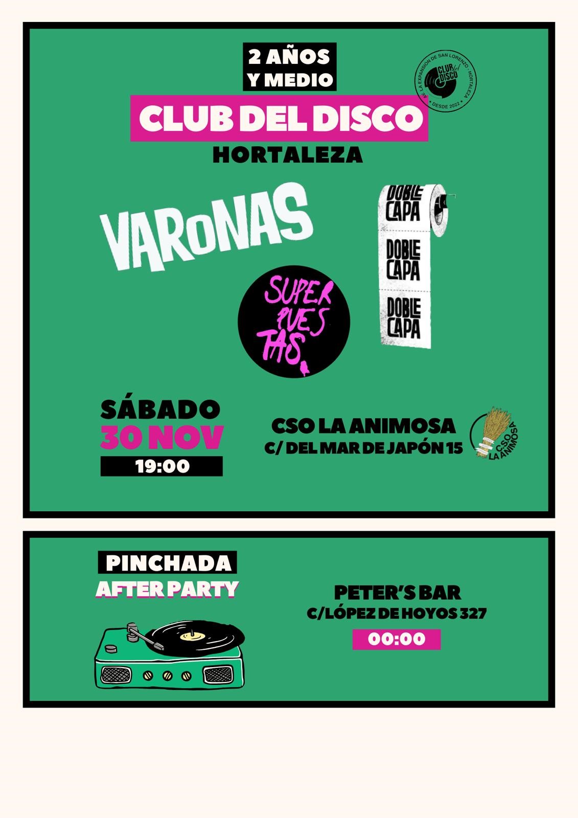 Para esta nueva fiesta aniversario del Club del Disco de Hortaleza, se va a contar con las actuaciones del cuarteto de power pop punk Varonas, el nueva banda noise de señoras que pretende hacer pospunk Superpuestas y la mezcla de blues y punk instrumental del dúo DobleCapa.