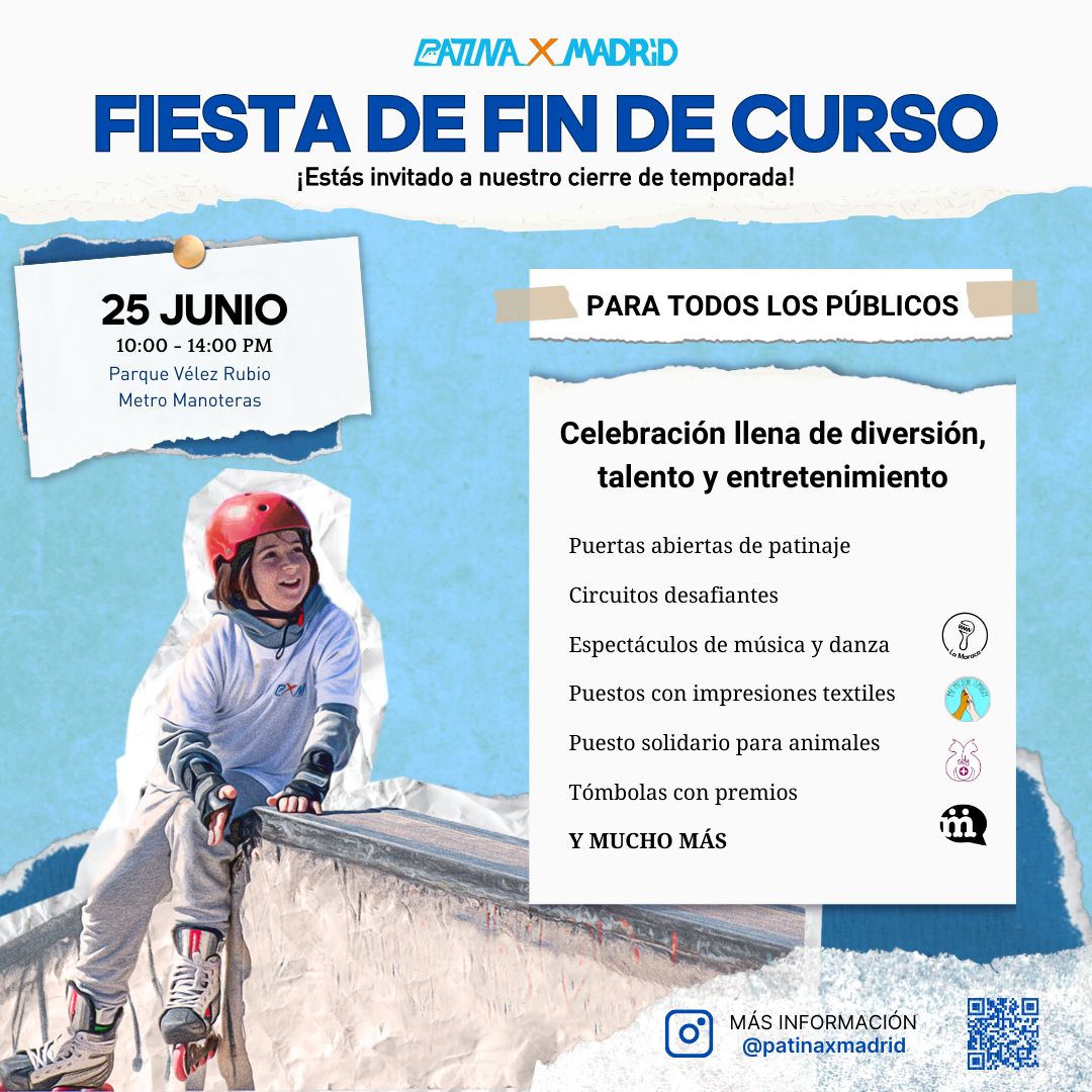 El domingo 25 de junio, de 10.00 a 14.00 horas, el club Patina X Madrid invita a todo el vecindario a celebrar su fiesta de fin de curso en el parque de Manoteras (calle Vélez Rubio, s/n).