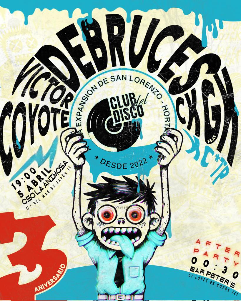 El sábado 5 de abril desde las 19.00 horas, el Club del Disco de Hortaleza celebra la fiesta por su tercer aniversario en el centro social La Animosa (calle Mar de Japón, 15. Metro San Lorenzo). La fiesta contará con las actuaciones en directo de Víctor Coyote, Debruces y CKGX feat. KC*TP.