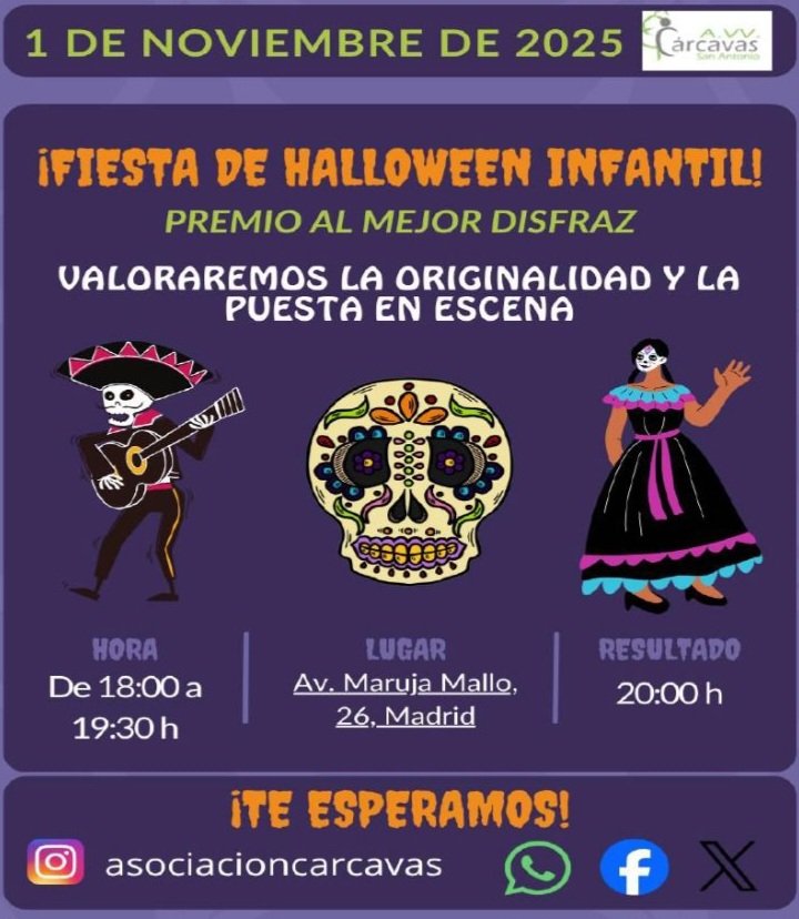 El sábado 1 de noviembre a las 18.00 horas, pasa una tarde terrorífica en la Fiesta infantil de Halloween que se celebra en la sede de la asociación vecinal Las Cárcavas-San Antonio en la plaza de la Unión (calle Maruja Torres, 26).