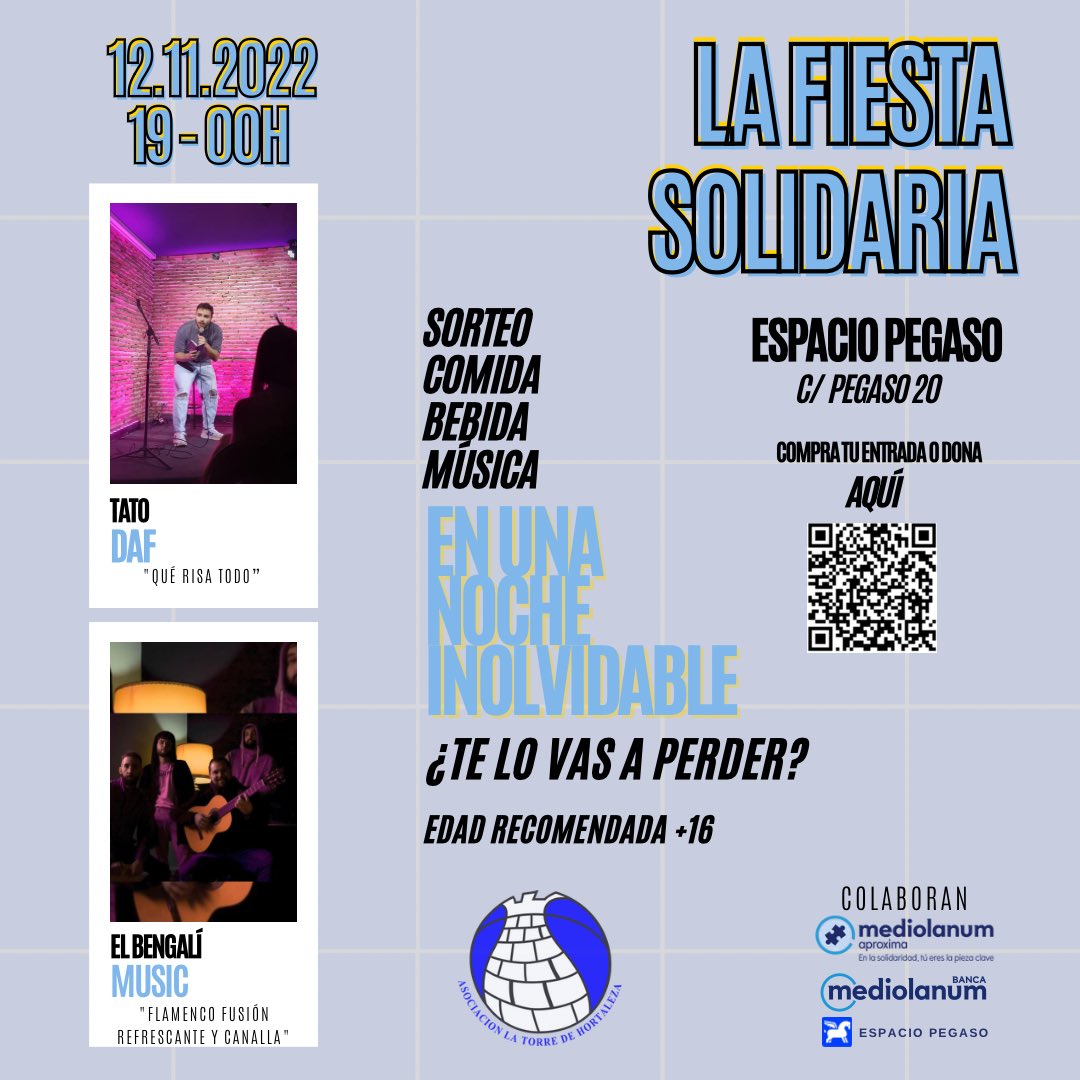 El sábado 12 de noviembre desde las 19.30 hasta las 00.00 horas, se celebra una fiesta solidaria para apoyar y recaudar fondos para la asociación La Torre de Hortaleza en el Espacio Pegaso (calle Pegaso, 20).