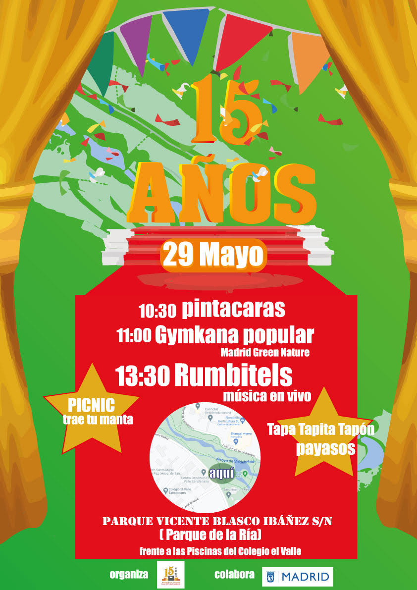 La asociación vecinal Sanchinarro invita al vecindario a celebrar con una fiesta su XV aniversario el domingo 29 de mayo, de 10.30 a 16.00 horas, en el parque Vicente Blasco Ibáñez (Camino Arroyo de Valdebebas, 13), más conocido como parque de la ría, frente a las piscinas del colegio El Valle.