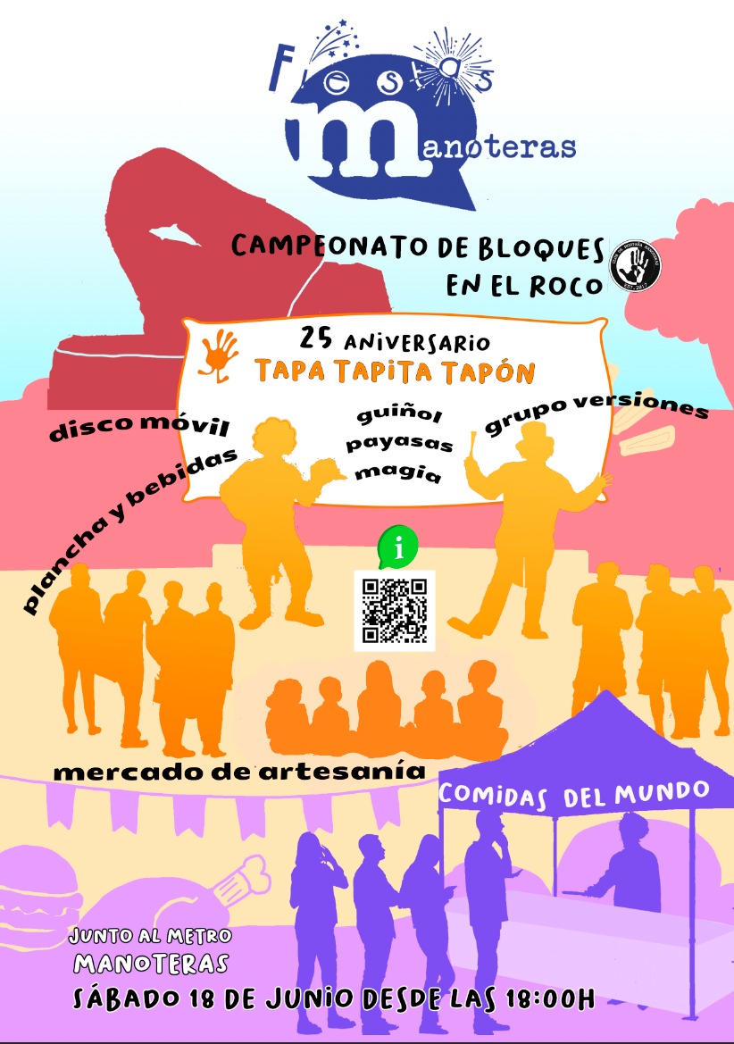 Las Fiestas de Manoteras van a celebrarse este año en una única jornada el sábado 18 de junio en el parque de Manoteras (calle Vélez Rubio con calle Bacares), junto a las gradas feministas.