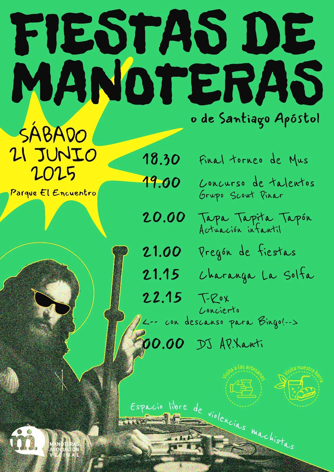 El sábado 21 de junio se celebran las Fiestas de Manoteras 2025, o Fiestas de Santiago Apóstol, organizadas por la asociación vecinal del barrio, que esta vez se trasladan al parque El Encuentro (calle Roquetas de Mar, s/n) después de que la Junta Municipal prohibiera el año pasado la celebración de las fiestas en su emplazamiento habitual, las canchas deportivos del parque de Manoteras.