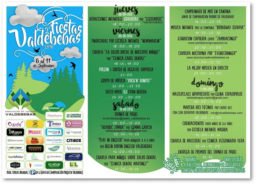 El barrio de Valdebebas vuelve a estar de fiesta del jueves 8 al domingo 11 de septiembre. El nuevo desarrollo urbano de Hortaleza prepara la segunda edición de sus fiestas vecinales, que se celebrarán en el aparcamiento de la Junta de Compensación, en la avenida de las Fuerzas Armadas.