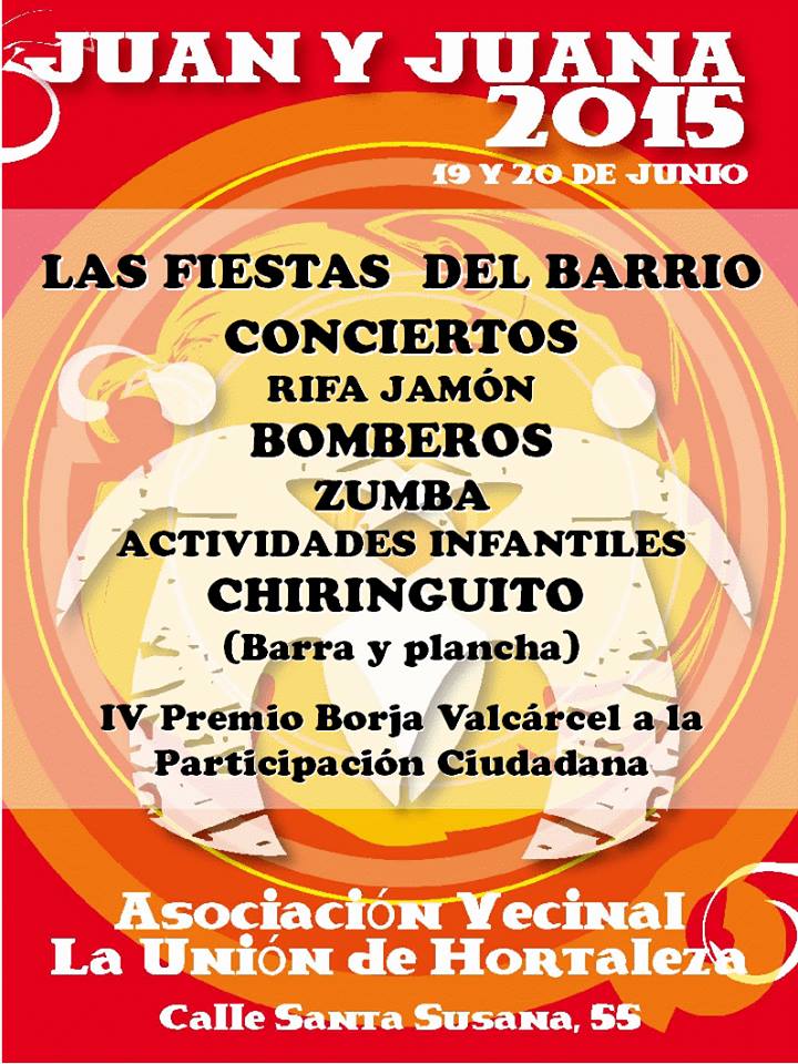 La asociación vecinal La Unión de Hortaleza vuelve a celebrar una nueva edición de las Fiestas de Juan y Juana para celebrar el solsticio de verano los días 19 y 20 de junio en la explanada ubicada frente al local de la asociación en la calle Santa Susana 55. Este es el programa de actividades: