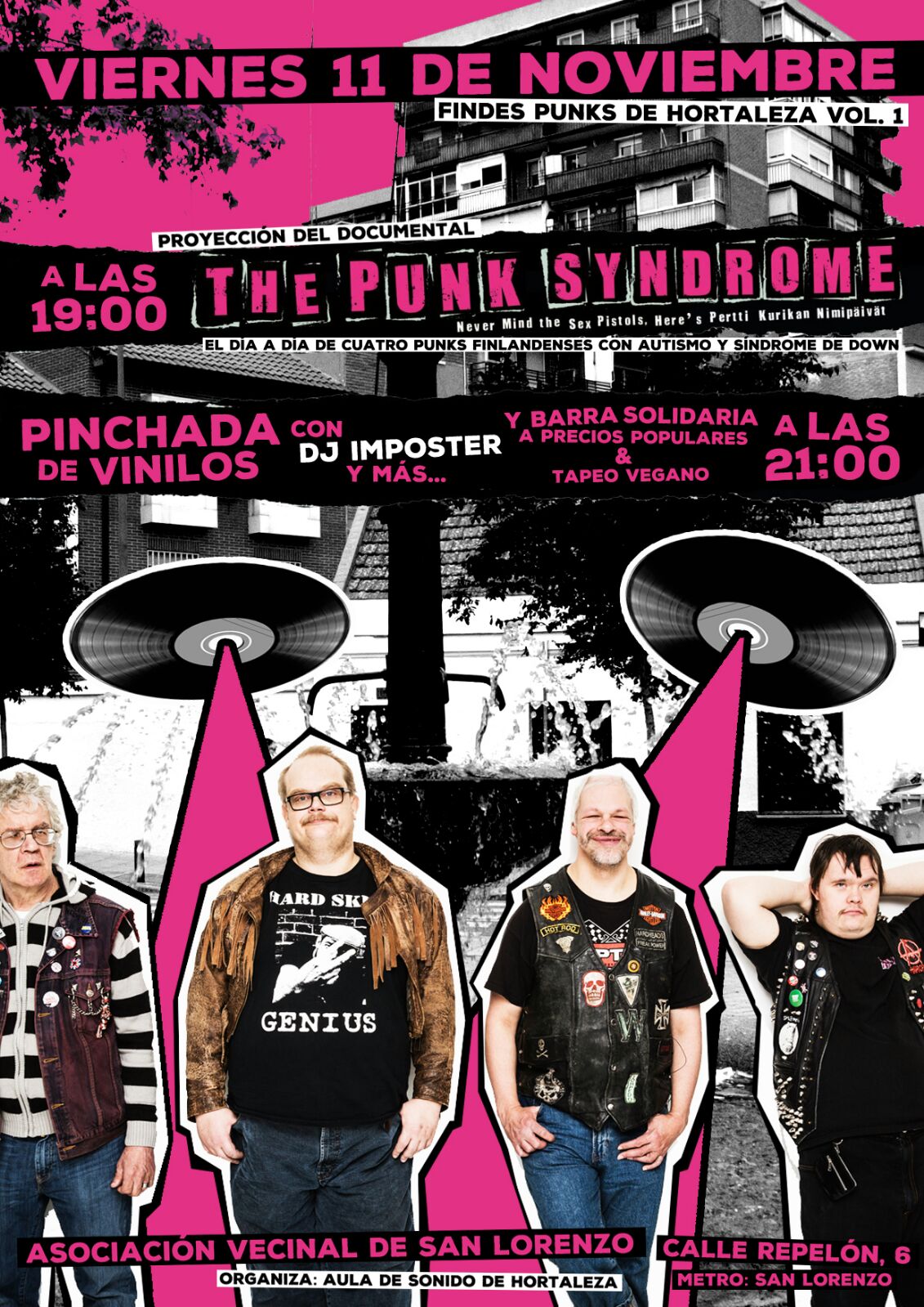 GratuitoEste viernes 11 de noviembre se estrenan los Findes punkis de Hortaleza con una primera sesión en la asociación vecinal de San Lorenzo (Calle Repelón, 6). La fiesta comenzará a las 19 horas con la proyección del documental ‘The punk syndrome’, que narra el día a día de cuatro punks finlandeses con autismo y síndrome de down.
