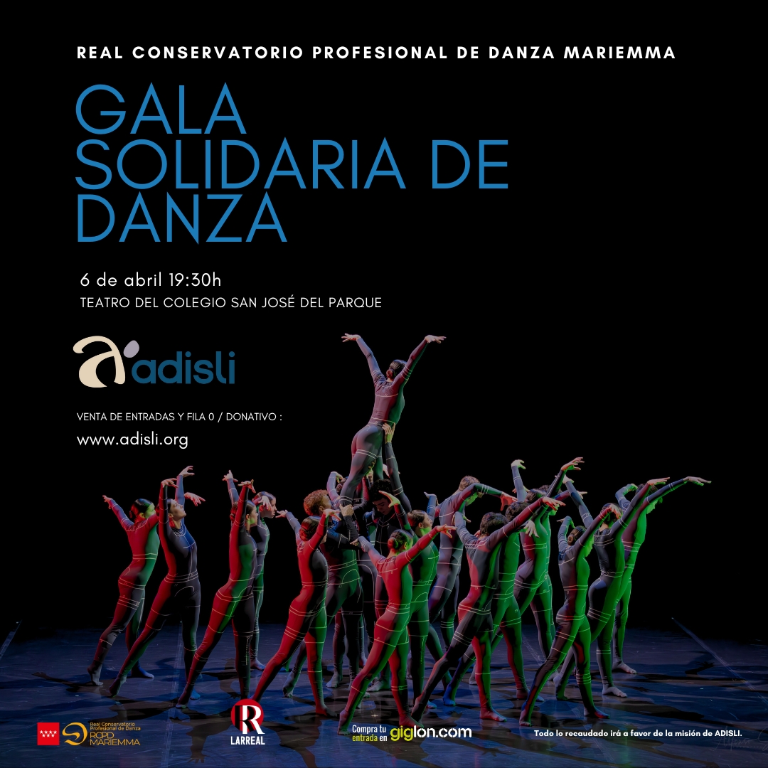 El sábado 6 de abril a las 19.30 horas, la organización de servicios sociales Adisli (Asociación para la Atención de Personas con Discapacidad Intelectual Ligera e Inteligencia Límite) celebra una gala solidaria de danza, acompañada de la música del Real Conservatorio Profesional de Danza Mariemma, en el teatro del colegio San José del Parque (Avda. de Champagnat, 2).