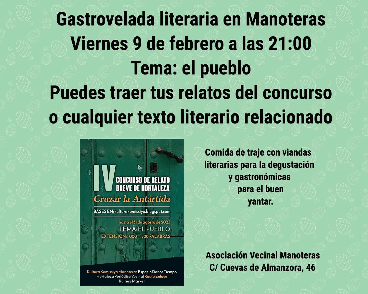 El viernes 9 de febrero, a las 21.00 horas, acércate a disfrutar de la gastrovelada literaria en la Soci de Manoteras (Cuevas de Almanzora, 46) en torno al tema del pueblo, protagonista del IV edición del Concurso de Relato Breve de Hortaleza «Cruzar la Antártida».