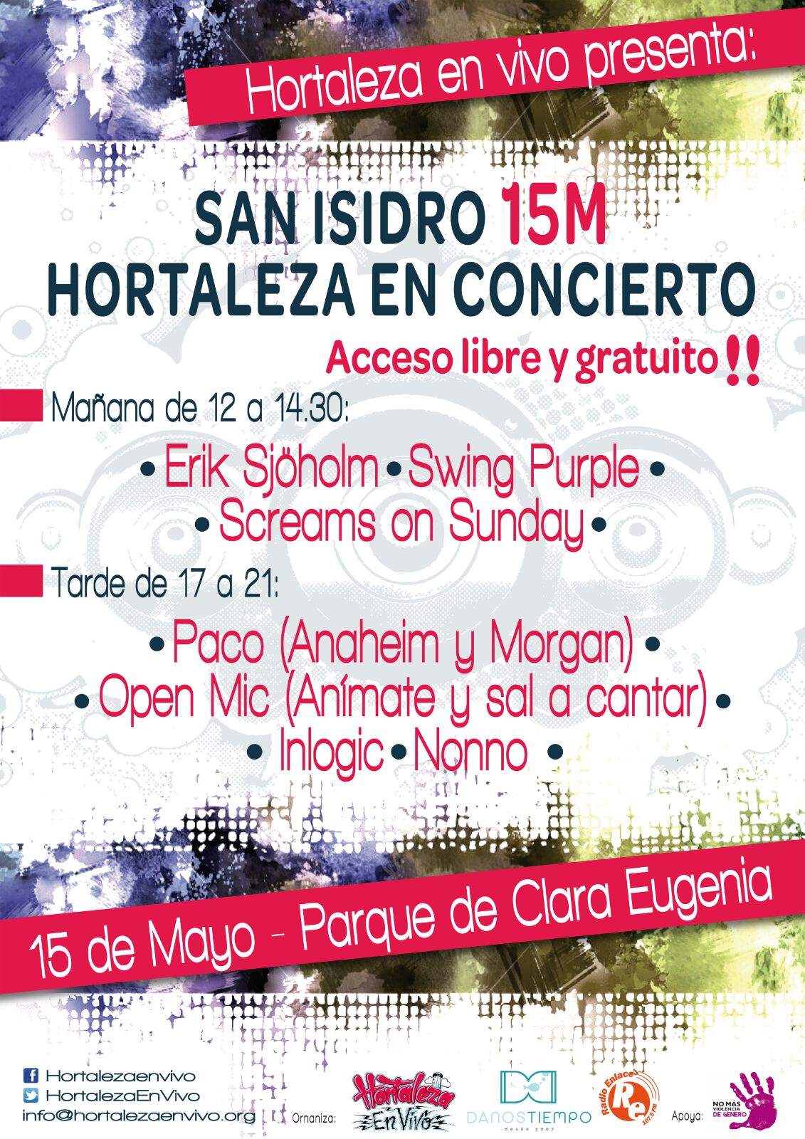 Este lunes 15 de mayo, San Isidro, la música sale a la calle en nuestro barrio gracias a la iniciativa Hortaleza en Vivo, que ha organizado una sesión doble de conciertos en el parque Isabel Clara Eugenia. Las actuaciones, que son gratuitas, tendrán un pase matutino y otro vespertino, y estarán protagonizadas por artistas vinculados con el barrio como el finlandés Erik Sjöholm y los grupos Swing Purple, Screams on Sunday, Nonno o Inlogic.
