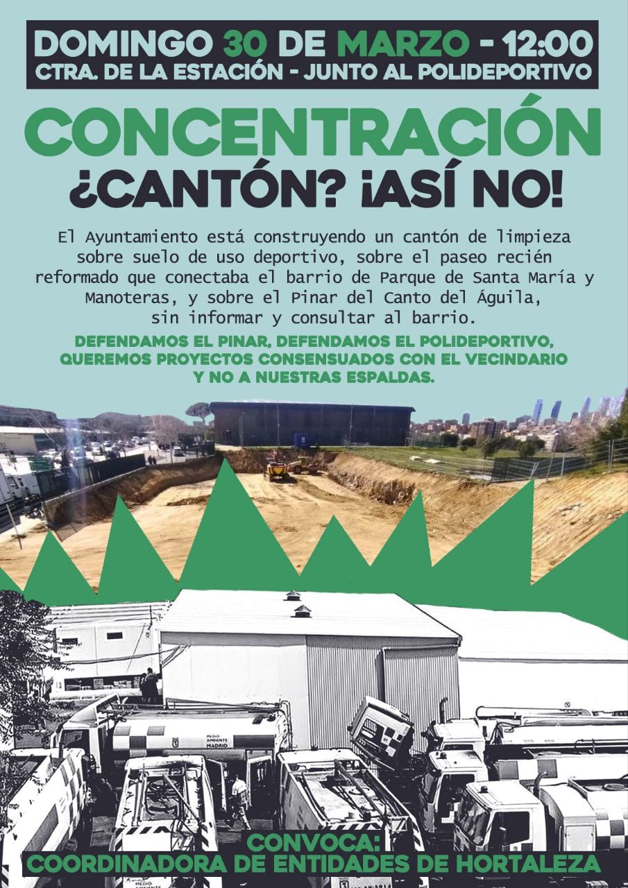 El domingo 30 de marzo a las 12.00 horas, la Coordinadora de Entidades de Hortaleza convoca una nueva concentración en defensa del polideportivo de Hortaleza (Carretera de la Estación de Hortaleza, 11) ante la construcción de un cantón de limpieza dentro del perímetro del centro deportivo municipal, unas obras que han provocado la tala de pinos y la destrucción de parte de un sendero recién hecho por el propio Consistorio, y del que no tenía constancia ni el vecindario ni los grupos políticos del distrito. “El proyecto no está definido”, afirma el concejal presidente del distrito, David Pérez, del Partido Popular.