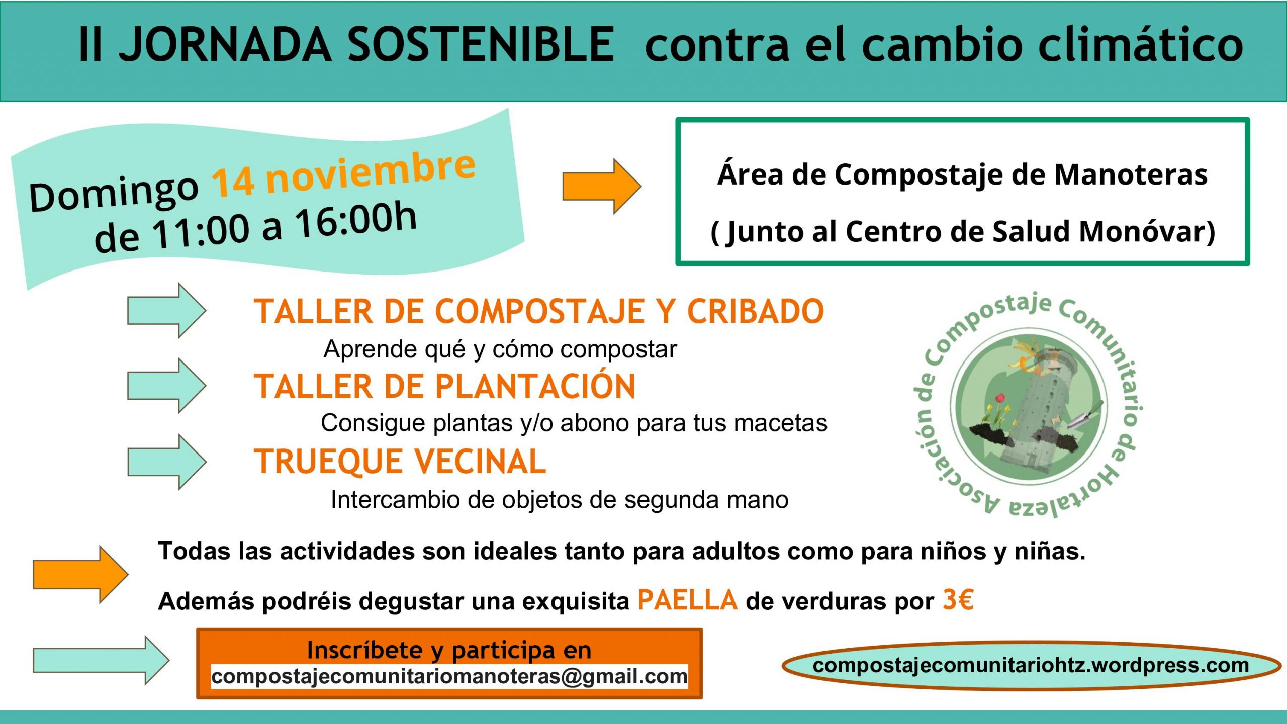 Desde la asociación Compostaje Comunitario de Hortaleza queremos invitaros a todas las vecinas y vecinos a la segunda Jornada Sostenible contra el Cambio Climático, que se celebrará el domingo 14 de noviembre, de 11.00 a 16.00 horas en el área de compostaje comunitario de Manoteras (junto al centro de salud Monóvar y detrás del centro integrado Santiago Apóstol).