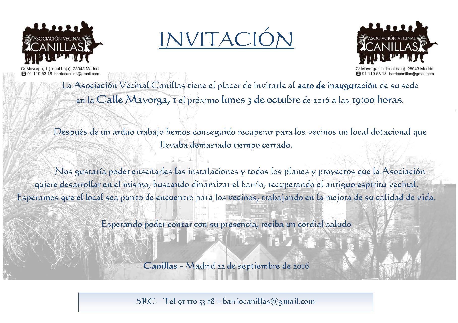 La asociación vecinal Canillas tiene el placer de invitar a todos los vecinos al acto de inauguración de su sede en la calle Mayorga 1 el próximo lunes 3 de octubre a las 19 horas. Después de un arduo trabajo, han conseguido recuperar para los vecinos un local dotacional que llevaba demasiado tiempo cerrado y, por ello, les gustaría enseñar a los vecinos las instalaciones y todos los proyectos que la asociación quiere desarrollar en él con el objetivo de dinamizar el barrio y recuperar el antiguo espíritu vecinal.