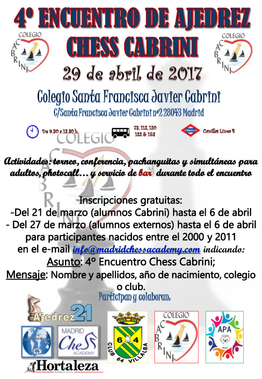 El sábado 29 de abril a las 9.00, el colegio Santa Francisca Javier Cabrini (Santa Francisca Javier Cabrini, 2) vuelve a acoger esta jornada de ajedrez destinada a escolares de toda la Comunidad de Madrid, con actividades para todas las edades.