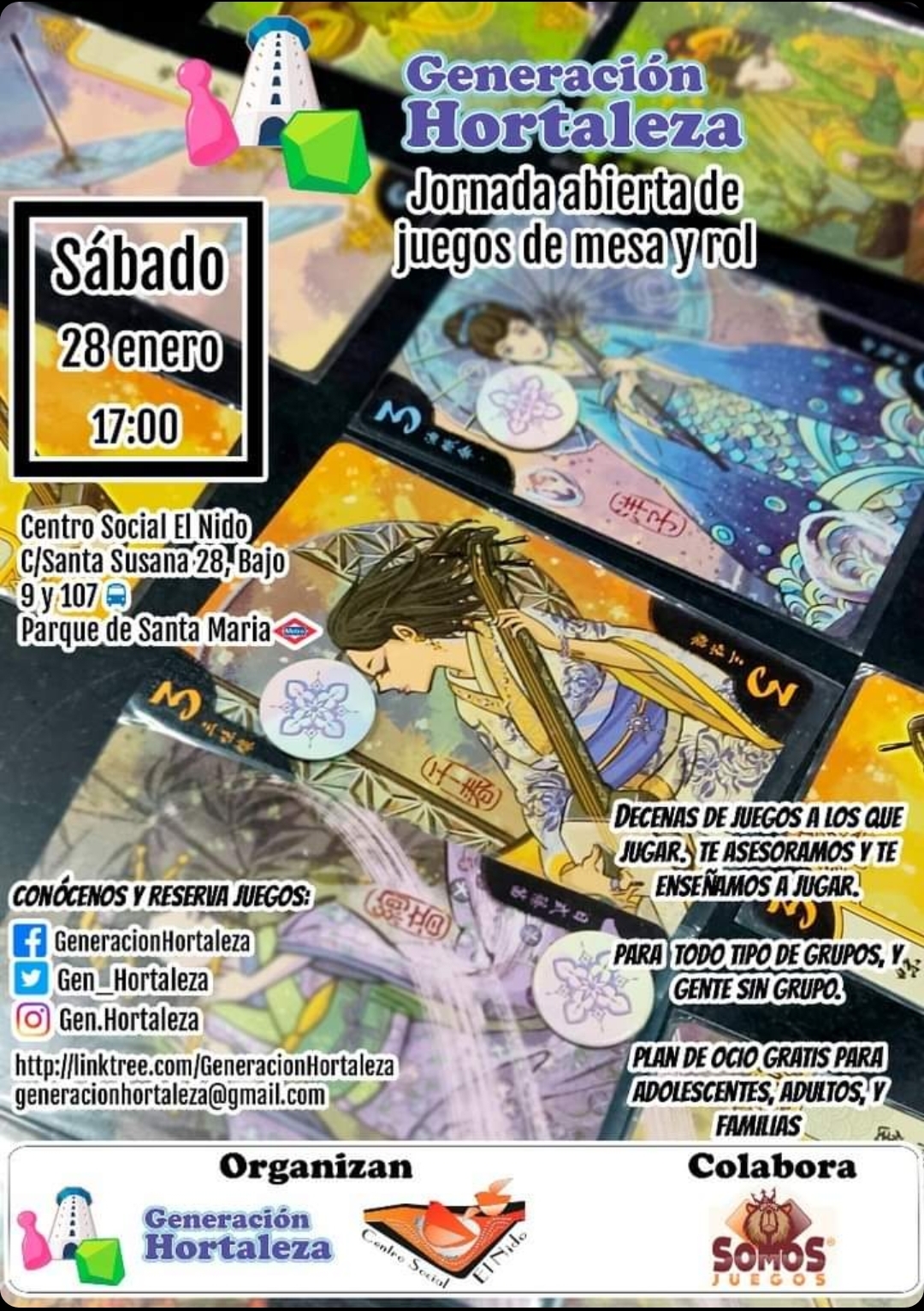 El sábado 28 de enero a las 17.00 horas, nueva jornada abierta de juegos de mesa y rol con Generación Hortaleza, en colaboración con Somos Juegos, en el Centro Social El Nido (calle Santa Susana, número 28 bajo).