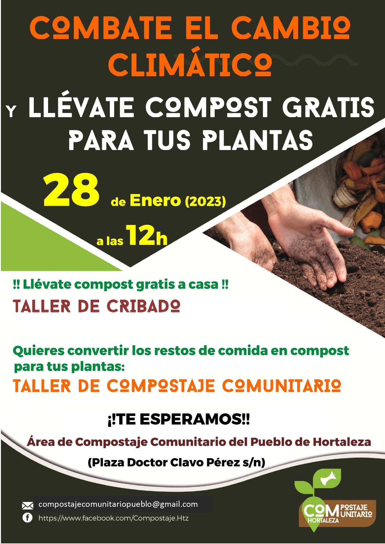 Desde la asociación Compostaje Comunitario de Hortaleza quieren invitar a todas las vecinas y vecinos a una nueva Jornada de compostaje, que se celebrará el sábado 28 de enero a las 12.00 horas en el área de compostaje comunitario de la Asociación Pueblo de Hortaleza (plaza Doctor Calvo Pérez, s/n).