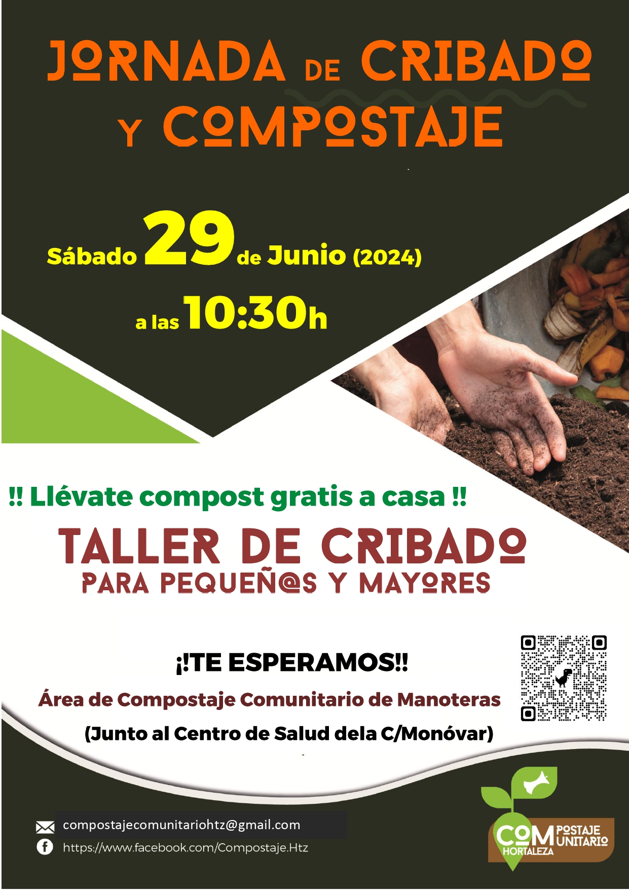 Aprenderemos en qué consiste el proceso de compostaje y cómo podemos convertir los restos orgánicos que generamos en abono. Además, cribaremos el abono que hemos obtenido en el área de compostaje comunitario de Manoteras.