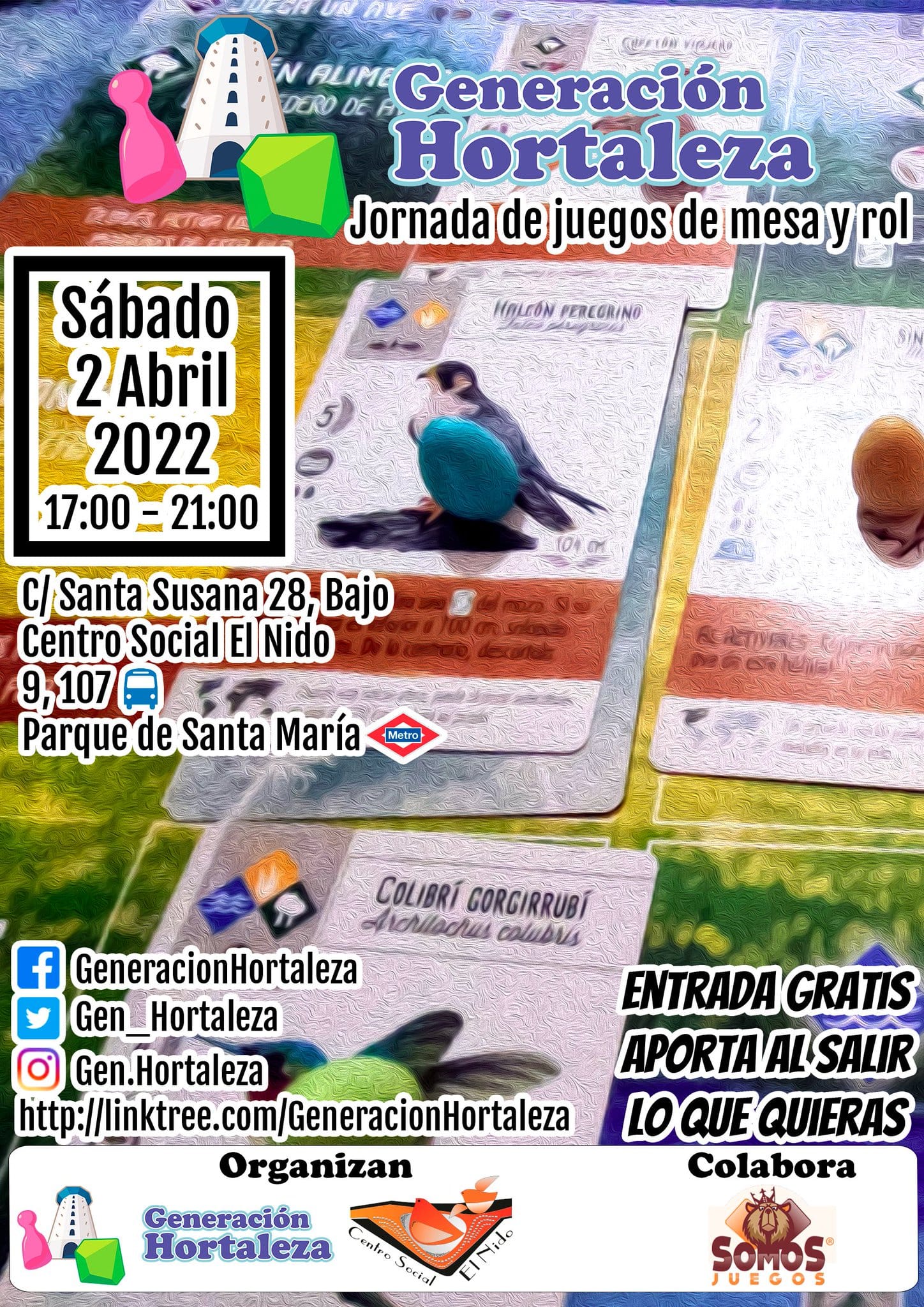 El sábado 2 de abril de 17.00 a 21.00 horas, continúa la jornada de juegos de mesa y rol de Generación Hortaleza, en colaboración con Somos Juegos, por la tarde trasladándose al Centro Social El Nido (calle Santa Susana, número 28 bajo).