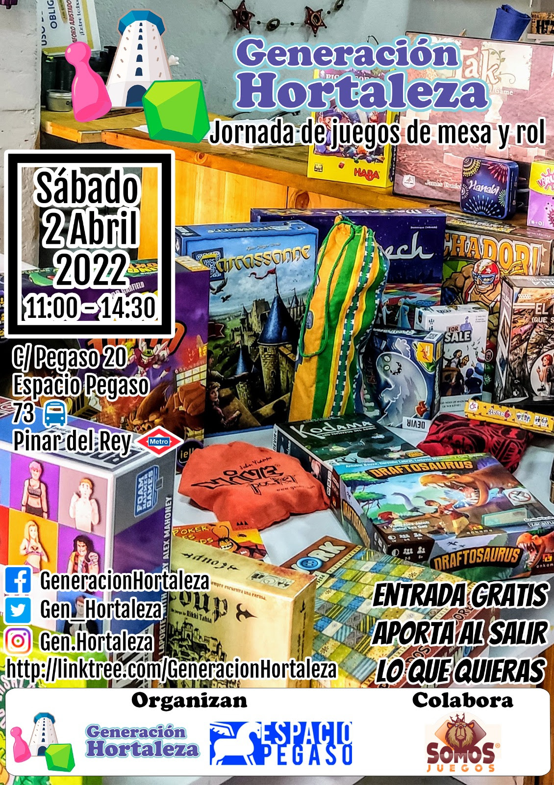 El sábado 2 de abril de 11.00 a 14.30 horas, con posibilidad de que el horario se extienda, Generación Hortaleza, en colaboración con Somos Juegos, celebra una nueva jornada de juegos de mesa y rol en el Espacio Pegaso (calle Pegaso, 20).