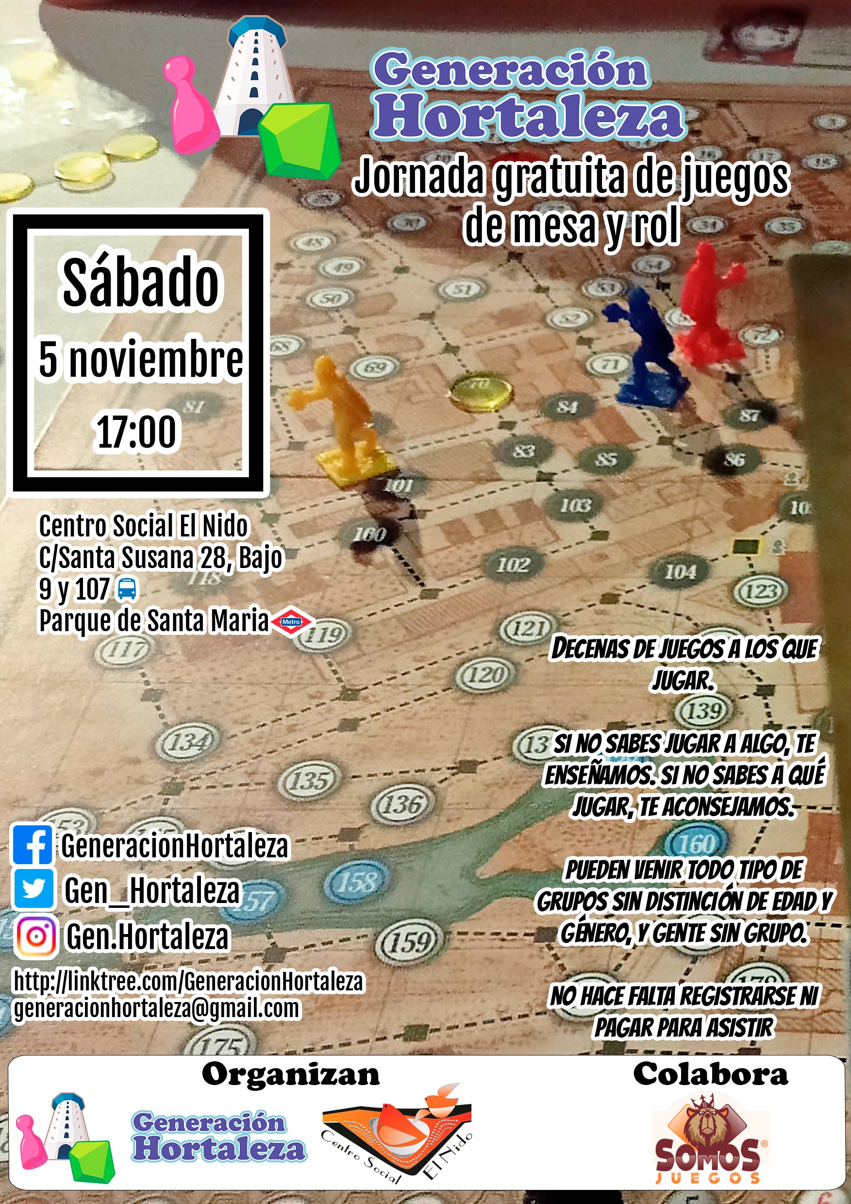 El sábado 5 de noviembre a las 17.00 horas, nueva jornada gratuita de juegos de mesa y rol con Generación Hortaleza, en colaboración con Somos Juegos, en el Centro Social El Nido (calle Santa Susana, número 28 bajo).
