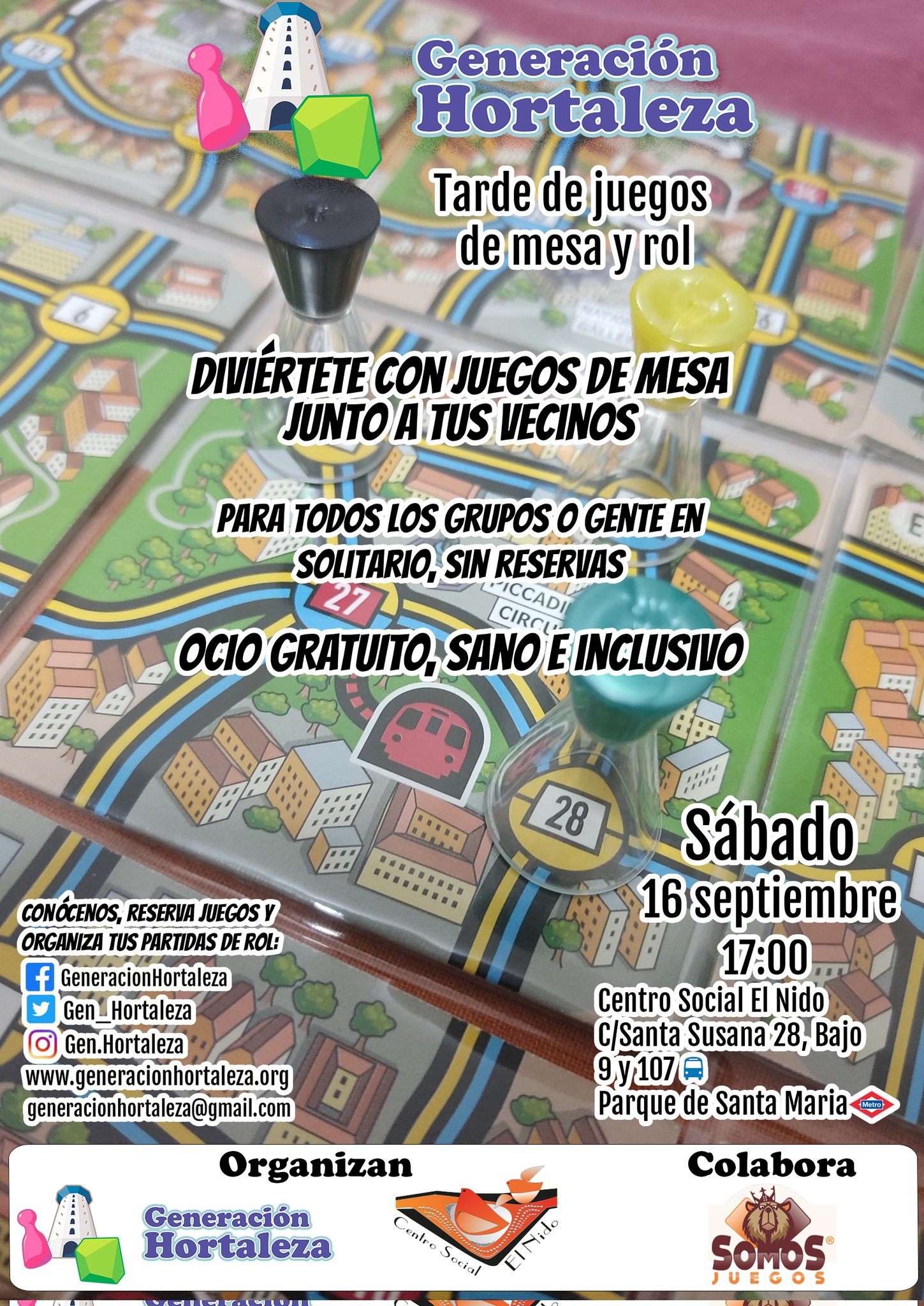 El sábado 16 de septiembre a las 17.00 horas, después del parón veraniego, Generación Hortaleza, en colaboración con Somos Juegos, organizan una nueva tarde de juegos de mesa y rol en el centro social El Nido (calle Santa Susana, número 28 bajo).