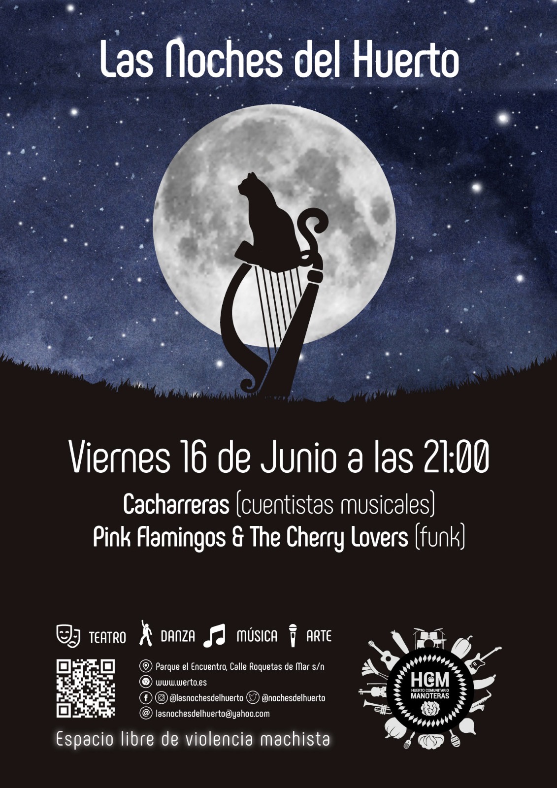 El viernes 16 de junio, a partir de las 21.00 horas, continúa el ciclo de actuaciones al aire libre Las Noches del Huerto de Manoteras con la actuación de las cuentistas musicales Cacharreras y el concierto del grupo Pink Flamingos & The Cherry Lovers en el teatro del Huerto Comunitario de Manoteras (calles Cuevas de Almanzora con Roquetas de Mar).