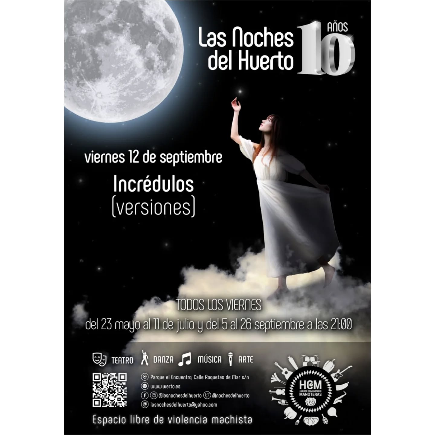 El viernes 12 de septiembre a partir de las 21.00 horas, continúa la décima temporada del ciclo de actuaciones al aire libre Las Noches del Huerto de Manoteras con el concierto de Incrédulos en el escenario del teatro del Huerto Comunitario de Manoteras (calles Cuevas de Almanzora con Roquetas de Mar).