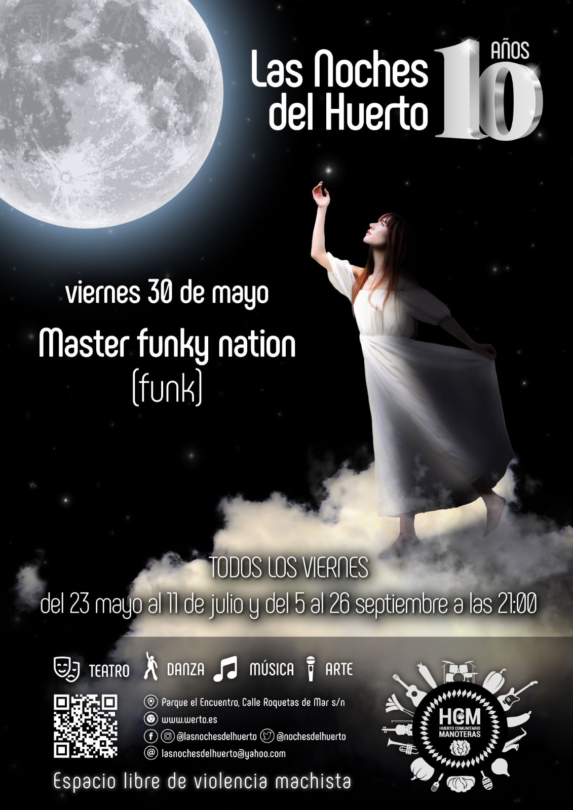 El viernes 30 de mayo a partir de las 21.00 horas, continúa la décima temporada del ciclo de actuaciones al aire libre Las Noches del Huerto de Manoteras con el concierto de Master Funky Nation en el teatro del Huerto Comunitario de Manoteras (calles Cuevas de Almanzora con Roquetas de Mar).