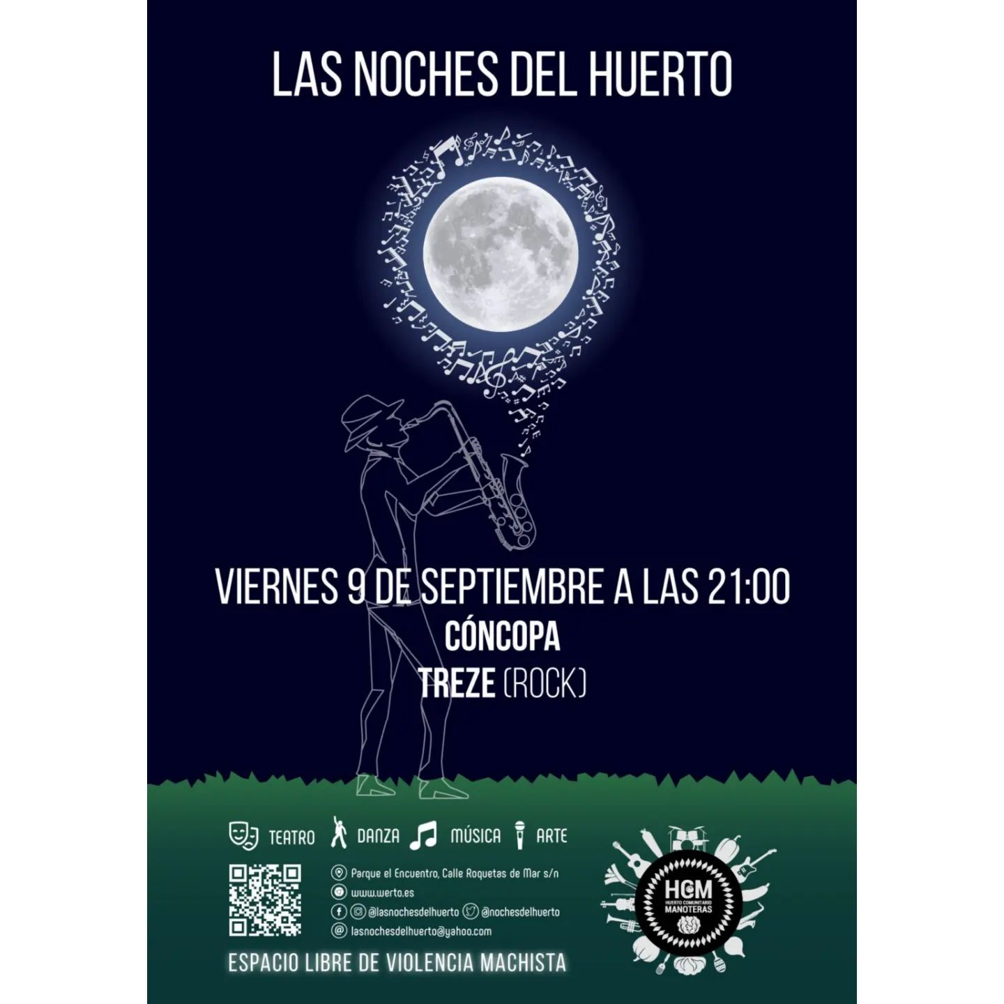 En esta ocasión, se sube al escenario el trío Cóncopa, que no os dejará indiferente (con acordeón incluido), y el grupo de rock Treze 13, que ya han visitado el huerto manoterano en otras ocasiones y que ya se han convertido en uno de los participantes más queridos de este ciclo de actuaciones culturales en las veladas de los viernes.
