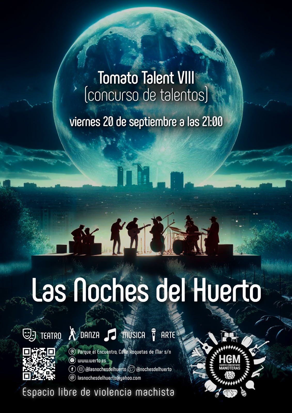 El viernes 27 de septiembre, a partir de las 21.00 horas, debido a la lluvia de la semana pasada, finaliza la novena temporada de la programación cultural al aire libre de Las Noches del Huerto de Manoteras con el Tomato Talent 2024 en el teatro del Huerto Comunitario de Manoteras (calles Cuevas de Almanzora con Roquetas de Mar).