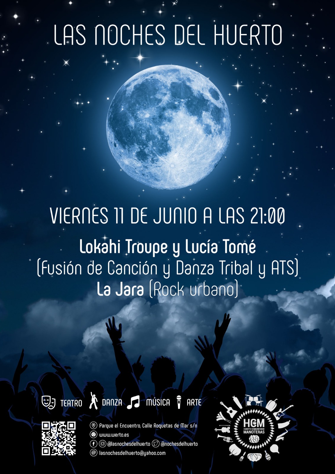 El viernes 11 de junio, a partir de las 21.00 horas, continúa el ciclo de actuaciones al aire libre Las Noches del Huerto de Manoteras con una fusión de canto y danzas tribales y concierto de rock urbano en el teatro del Huerto Comunitario de Manoteras (Cuevas de Almanzora con Roquetas de Mar).