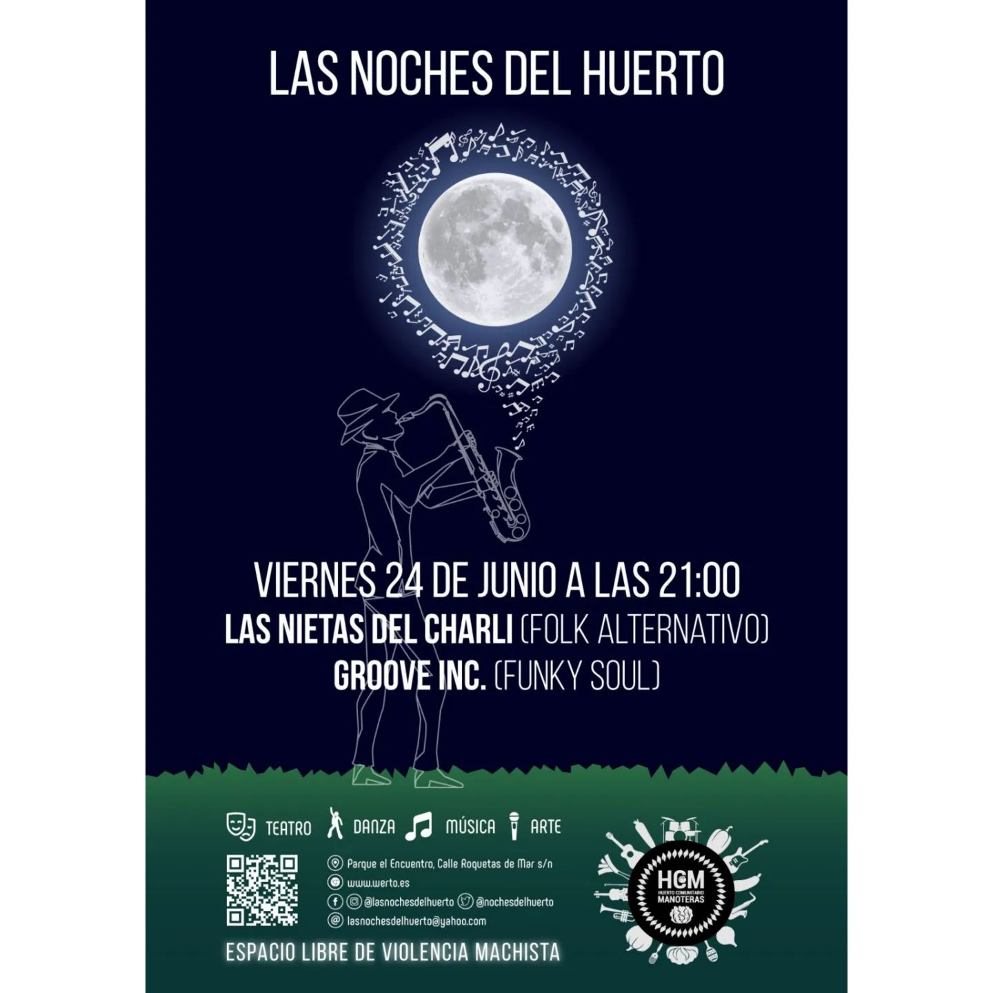 El viernes 24 de junio, a partir de las 21.00 horas, continúa el ciclo de actuaciones al aire libre Las Noches del Huerto de Manoteras con Las Nietas de Charli (folk alternativo) y Groove Inc. (funky soul) en el teatro del Huerto Comunitario de Manoteras (calles Cuevas de Almanzora con Roquetas de Mar).